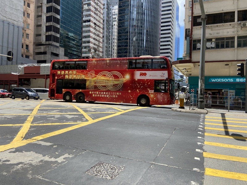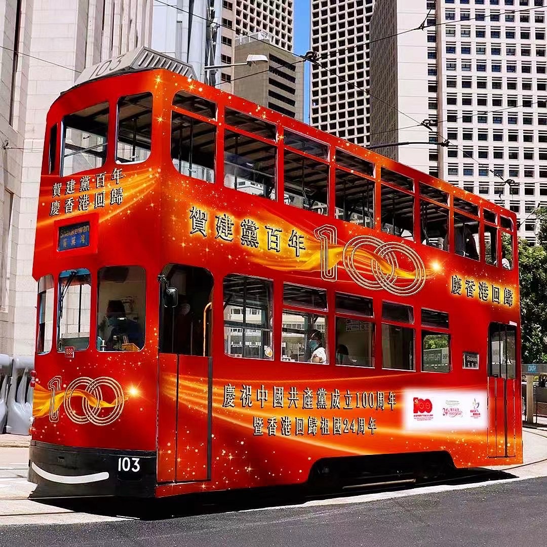 大公文匯全媒體報道,今年是中國共產黨成立100周年,再過幾天就是中國共產黨百年華誕,也是香港回歸祖國24周年紀念日。記者在香港街頭看到,有多輛巴士及電車車身噴上「賀建黨百年 慶香港回歸」的慶祝標語,迎接中國共產黨百年華誕和香港回歸祖國24周年紀念日的到來。