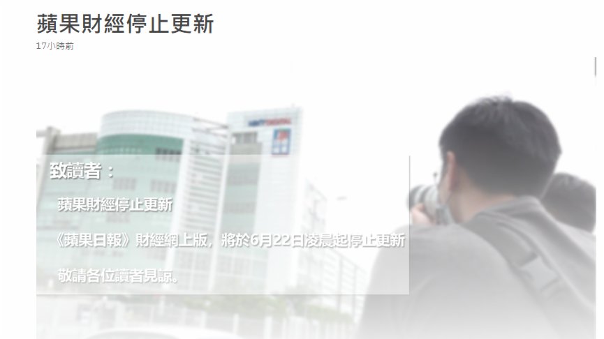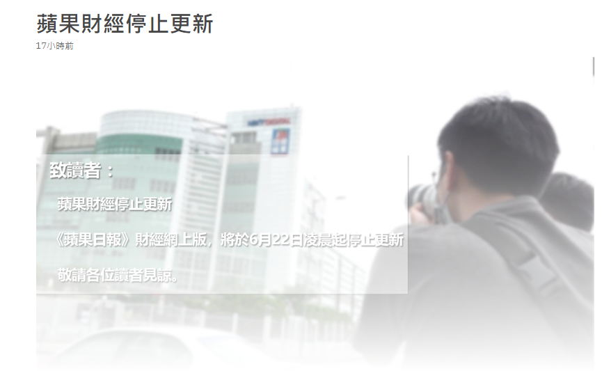 大公文匯全媒體報道,《蘋果》財經網上版宣布,今日(22日)凌晨起停止更新。其財經網上版在焦點新聞位置,以簡短啟事公布停止更新的消息,未有表述原因,只稱「敬請各位讀者見諒」。