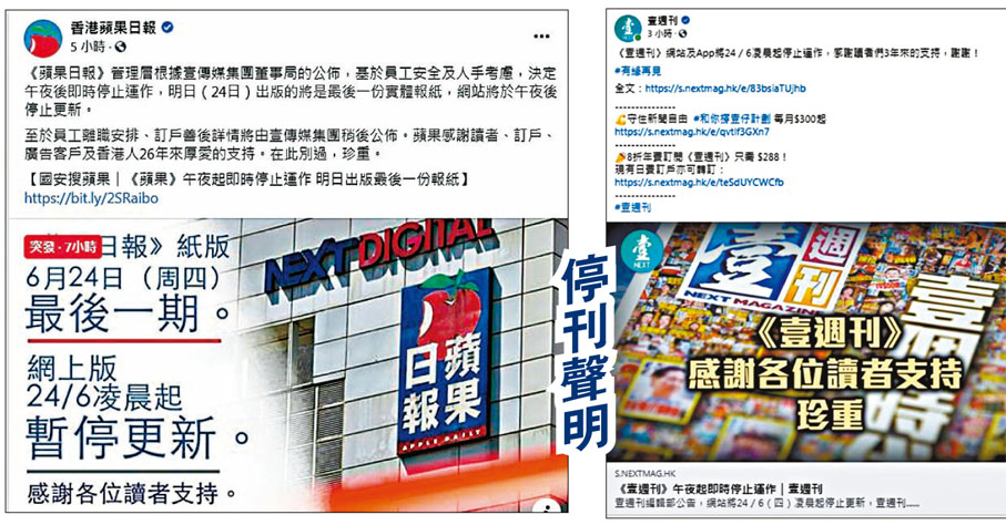 (香港文匯報記者 鄭治祖)香港特區政府保安局早前引用香港國安法凍結《蘋果日報》三家相關公司的資產,《蘋果日報》陷入財政困難,引發大量員工「跳船」辭職。昨日《壹週刊》和《蘋果日報》相繼宣布停止營運。《蘋果日報》管理層根據壹傳媒董事局的公布,決定於昨晚午夜停止運作,網站停止更新,《動物蘋台》等fb及網站亦會同時停止運作,今日會出版最後一份實體報紙。《壹週刊》網站和應用程式,屬下的《飲食男女》等亦於昨晚11時59分開始停止運作。至此,壹傳媒創辦人黎智英在港的「政治工具」全部宣布執笠。有政界人士在接受香港文匯報訪問時表示,壹傳媒有此下場完全是咎由自取,但香港仍然要提高警覺,包括繼續跟進假新聞法等,防止有人以新聞機構為名再次行撕裂社會甚至顛覆國家之事。