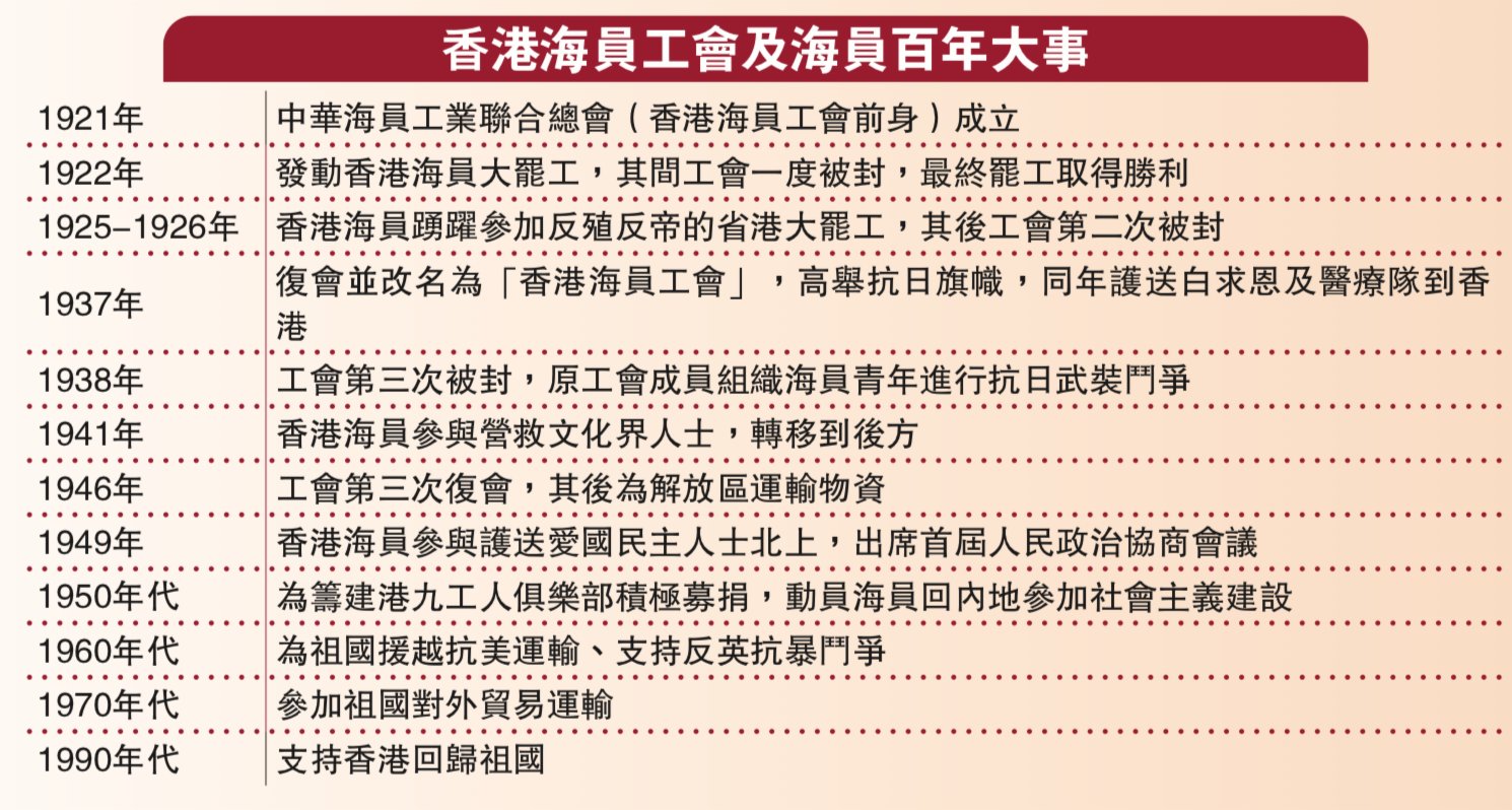 (大公報 記者 胡家俊)百年前的香港海員有如「海外孤兒」,漂泊在外飽受欺壓。1921年,中華海員工業聯合總會成立,為爭取海員合理權益,反抗帝國主義壓迫,翌年發動香港海員大罷工,引領中國工運之先。1925年,震驚中外的「五卅慘案」爆發,中國共產黨創立的中華全國總工會,領導了省港大罷工運動,廣大海員積極投身其中。其後,更多海員前仆後繼地加入抗日救亡運動、加入中共領導的東江縱隊抗日游擊隊,支持新中國建設等等,與祖國同行。