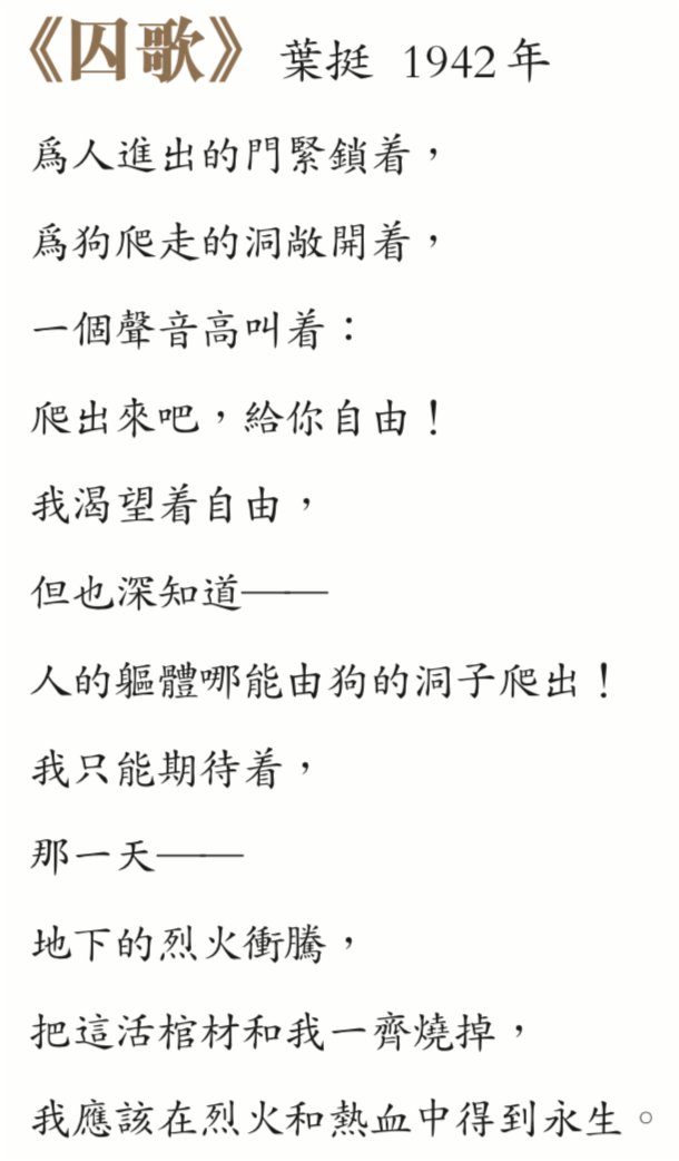 1942年11月21日,葉挺在重慶紅爐廠囚室中寫下《囚歌》,並託夫人將詩稿帶給摯友郭沫若。郭沫若感慨地說:「這裏燃燒着無限的憤激,但也輻射着明徹的光輝……他的詩是用生命和血寫成的,他的詩就是他自己。」
