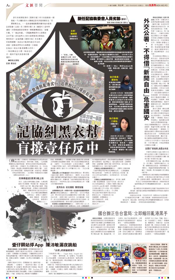 針對一小撮美西方政客肆意將香港警方有關《蘋果日報》及其部分管理層的依法執法行為,抹黑為香港國安法「打壓」所謂「言論自由」和「新聞自由」,中國外交部駐港公署發言人昨日強調,任何個人和機構不得借新聞自由之名,行危害國家安全、破壞社會穩定之實。任何試圖打「香港牌」來破壞香港繁榮穩定、遏制中國發展的行徑,都是螳臂擋車,注定失敗!