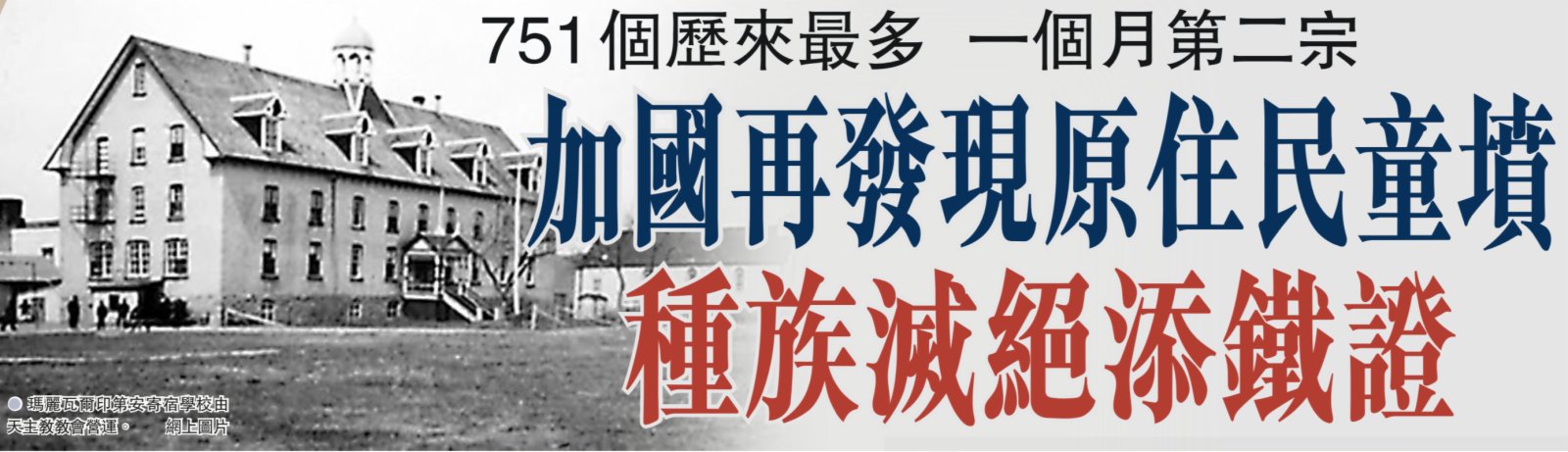 卑詩省一間原住民寄宿學校舊址,上月發現215具兒童遺骸,事件轟動全國社會。當地原住民組織發言人威爾遜前日稱,接連在兩間寄宿學校舊址合共發現近1,000個無標記墳墓,只是一個開端,她預計隨着愈來愈多無標記的兒童墳墓「重見天日」,可怕的種族滅絕真相將陸續曝光,最終或會在全國發現數百萬個墳墓。