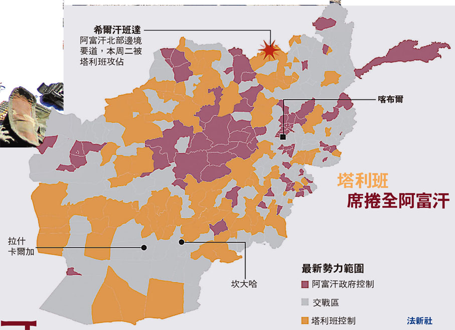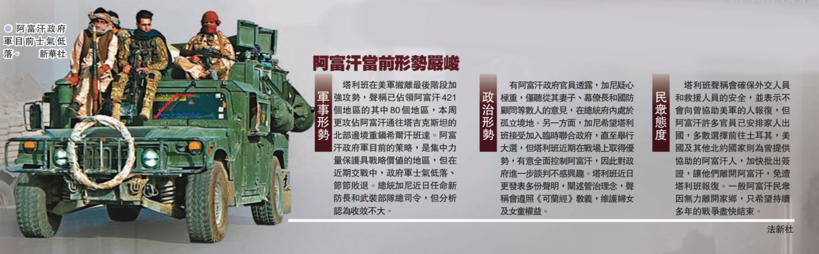 然而塔利班上周席捲阿富汗北部,奪取數十個地區及包圍多個主要城市後,美國情報機關修改早先較樂觀的評估報告。最新報告指出,塔利班過去一周在阿富汗北部發起閃電攻勢,已佔領大部分鄉郊地區,政府軍經常多個月不獲發軍餉,士氣極度低落,屢屢不戰而降,棄下大量悍馬裝甲車、迫擊炮、重型機槍及其他美國提供的裝備,換取塔利班保障他們撤退時的安全,這批軍備落入塔利班之手,大大加強塔利班的實力。