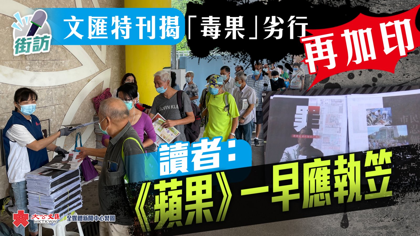 《蘋果日報》24日停刊,各界痛斥《蘋果日報》長期散布假消息,挑動社會矛盾,禍害香港,執笠是咎由自取。香港文匯報製作的特刊《罪·無可恕——毒蘋果漢奸黎劣行錄》詳細揭批了《蘋果日報》惡行,自本月19日首次推出後廣受讀者歡迎,兩次加推仍供不應求,市民強烈要求加印。今日文匯報特刊再次加印並在香港各區派送,取報讀者絡繹不絕大排長龍。
