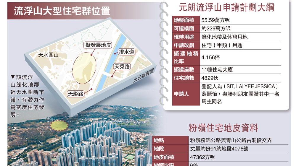 (大公報記者 梁穎賢)政府大力於新界開山劈石挖住宅供應,發展商響應加快農地及綠化地發展。新近有財團申請將流浮山一幅綠化地改作住宅用途,擬建11座住宅大樓的大型私人屋苑,提供4829伙,等同鄰區天水圍嘉湖山莊三分一的規模,總樓面高達229萬方呎,超過大圍站柏傲莊共3期逾200萬方呎。一幅粉嶺住宅地皮同於昨日截標,共收17標。