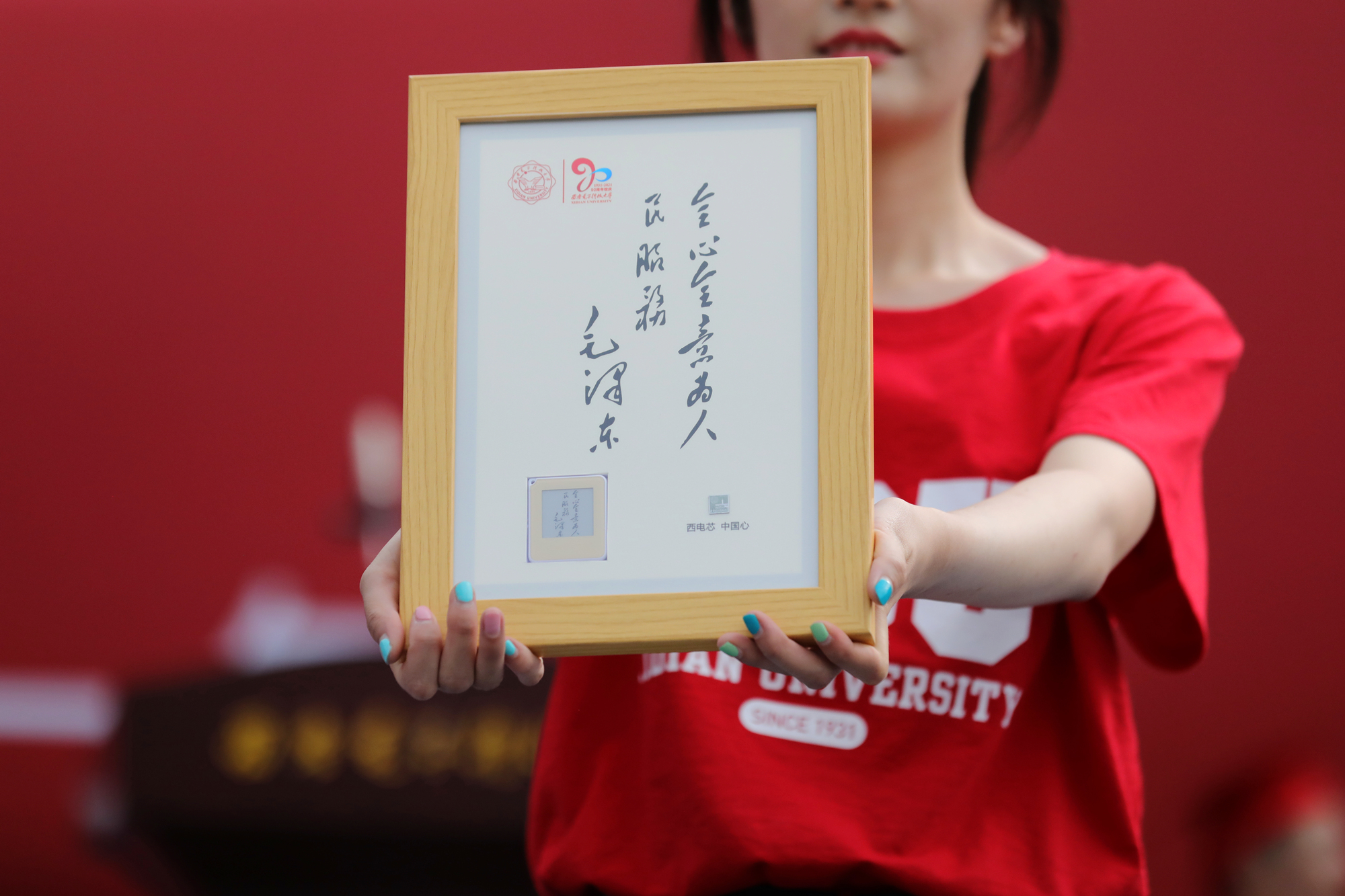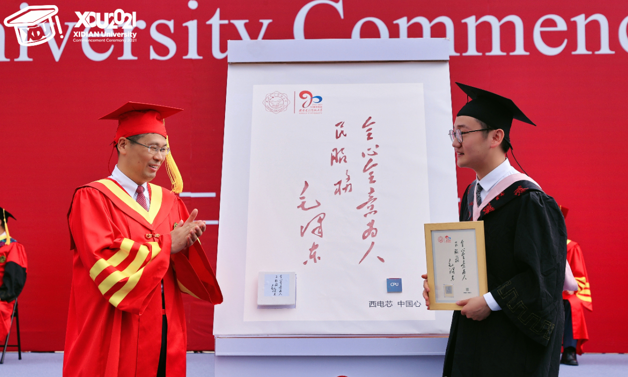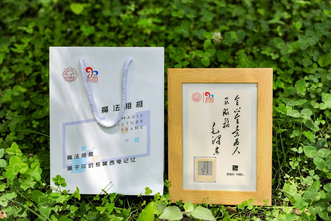 在日前舉行的2021屆畢業典禮上,這款本年度畢業生專屬的紀念「魔法相框」一亮相,不僅獲得全校師生的點讚,同時更引得往屆無數西電畢業生羨慕不已。該相框外框主背景為1949年毛澤東主席為西安電子科技大學親筆題詞「全心全意為人民服務」。左上角則為校徽和90周年校慶LOGO。外框右下角嵌入西電自主設計生產的硅基芯片,外框左下角則嵌入根據硅基芯片原理設計的「魔法相框」,採用墨水彩屏射頻傳輸,通過手機NFC實現圖片的刷新輸出。