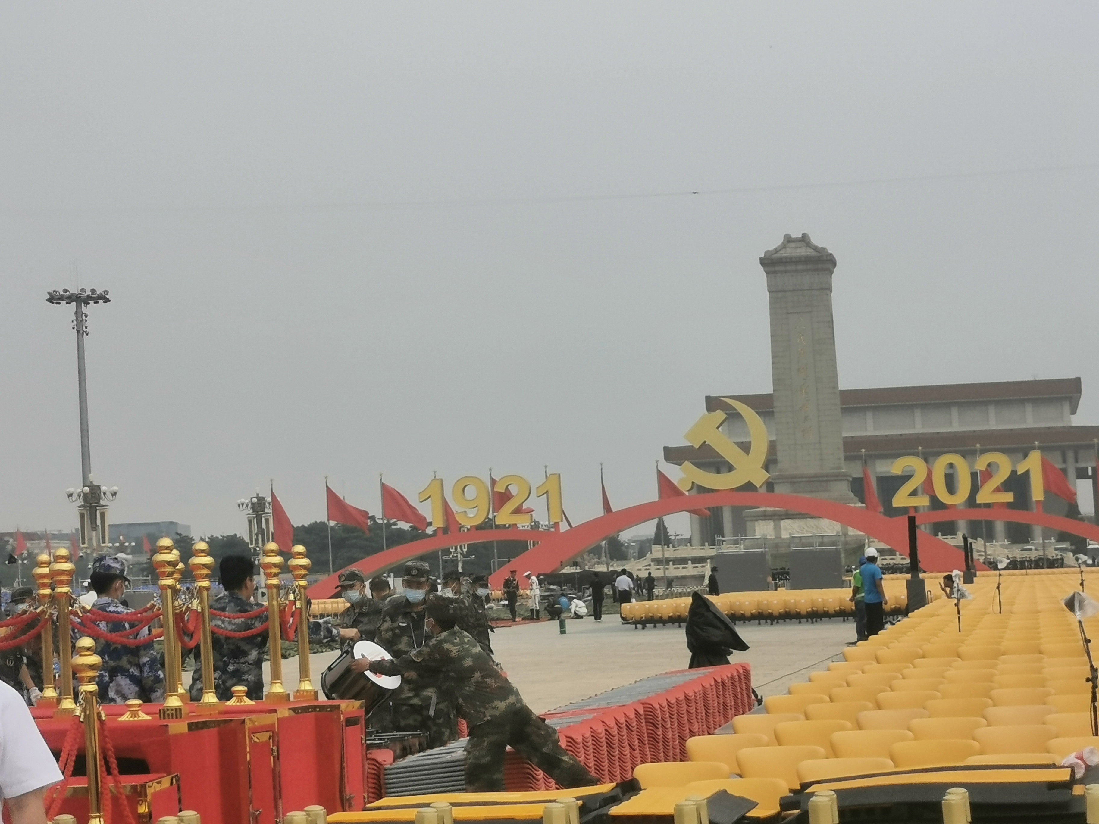 在天安門廣場上,工作人員緊張進行布置工作,一排排座椅已整齊擺放,每個座椅前用數字進行編號,目測可容納萬人以上。人民英雄紀念前,三個拱形建築托起的「1921」、黨徽、「2021」格外顯眼,象徵中國共產黨自1921年成立以來,已經走過了100年的光輝歷程。