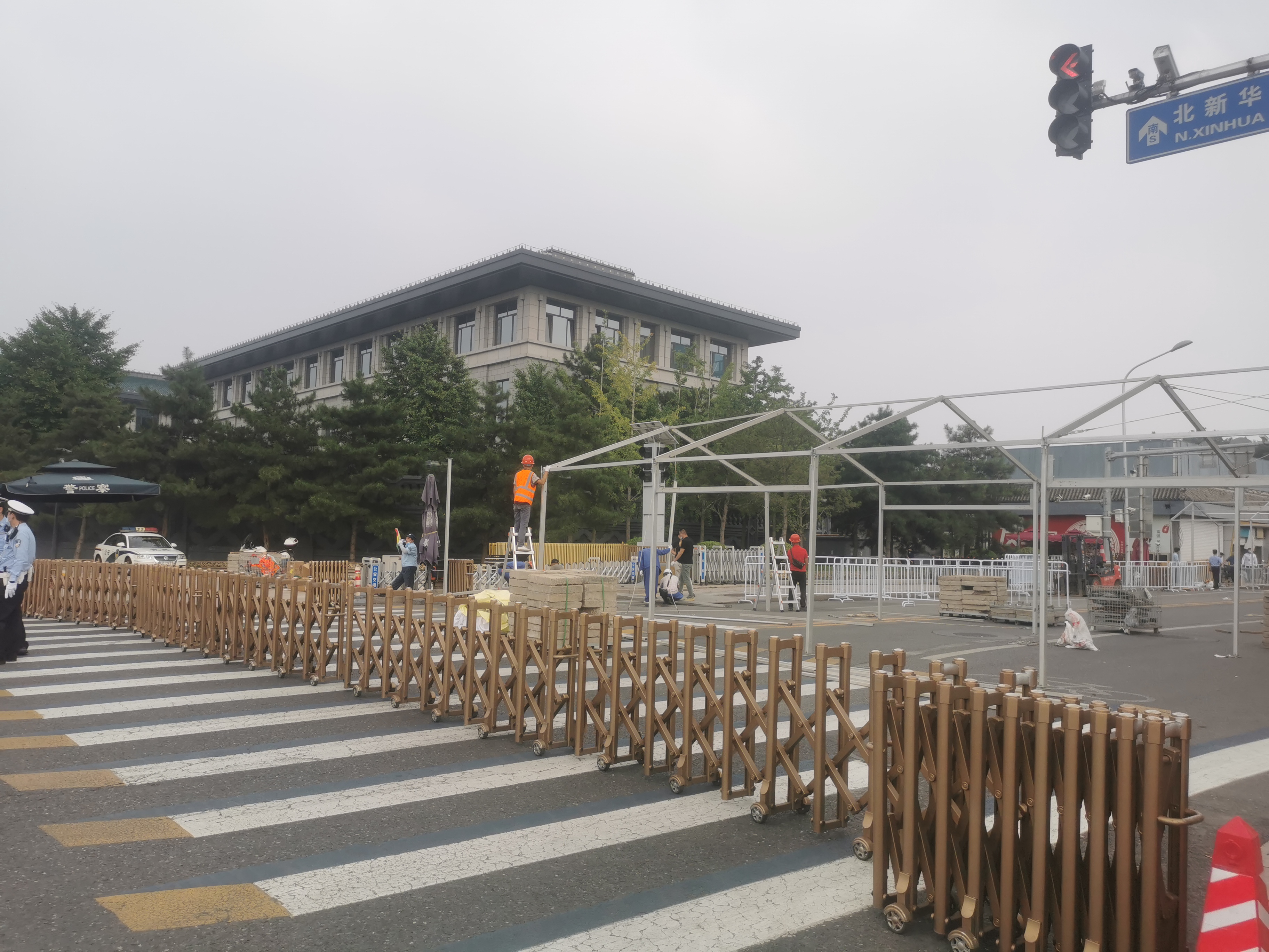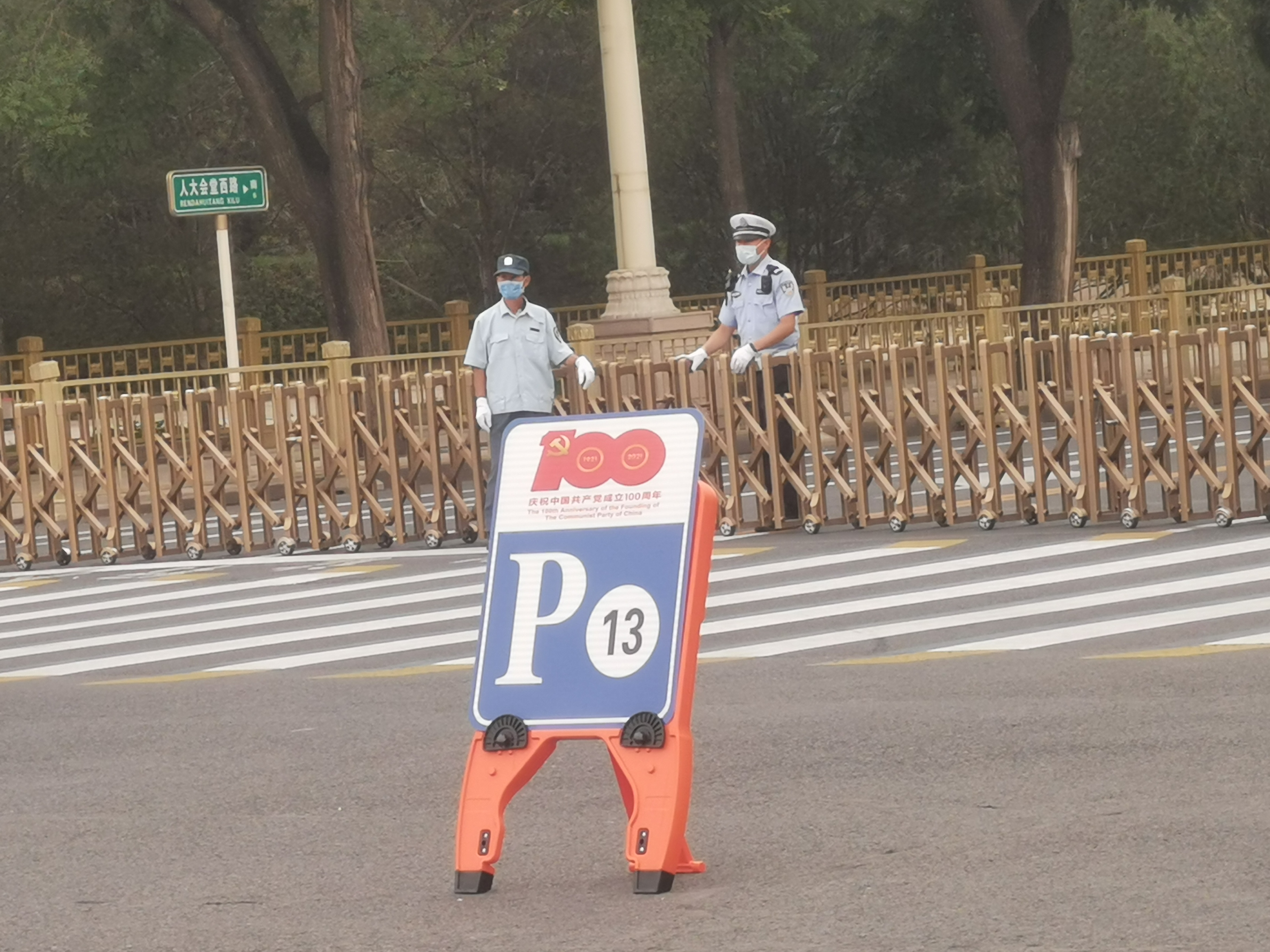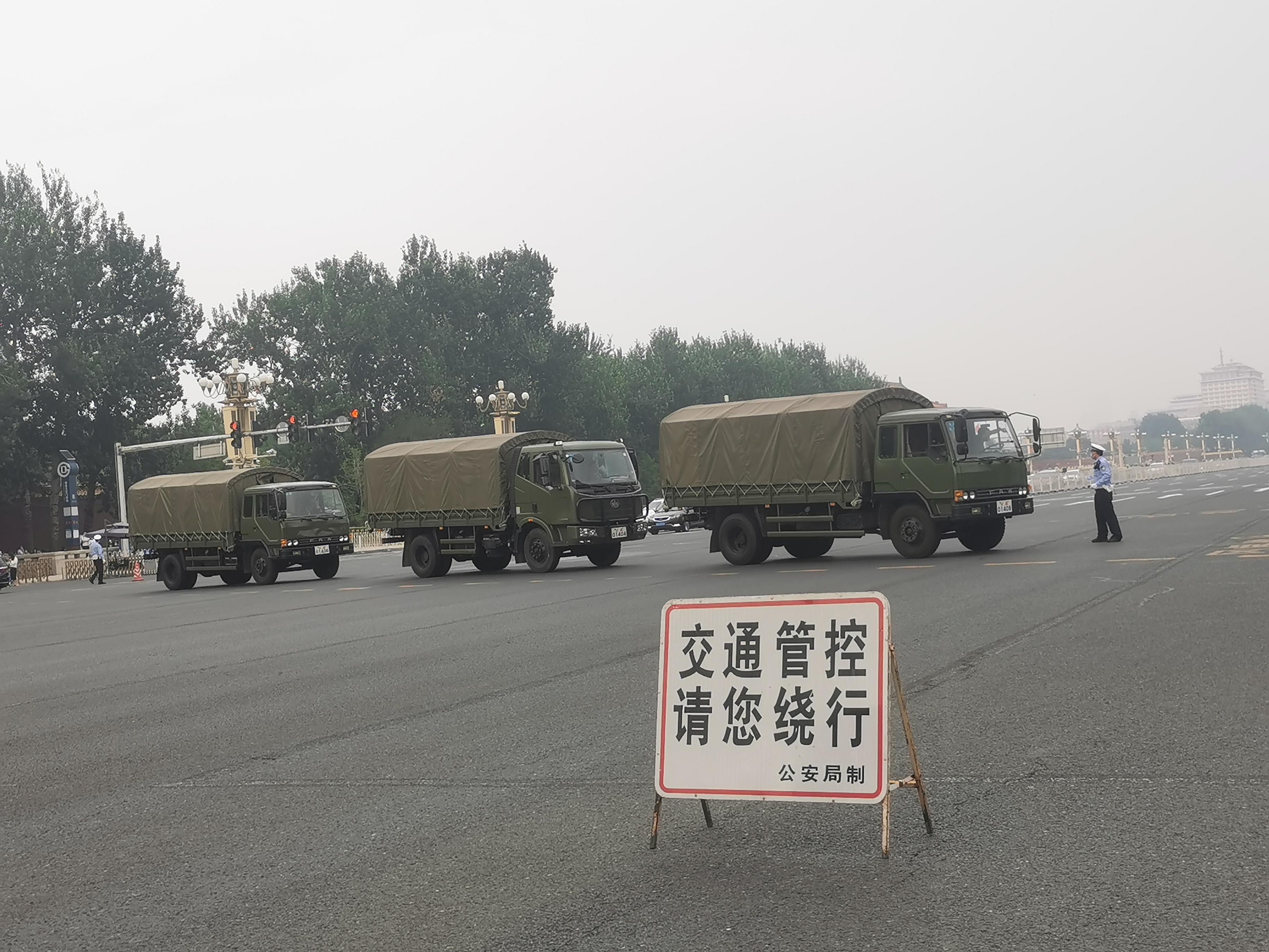 自6月26日14時開始,北京天安門地區及相關道路開始分時、分段採取臨時交通管理措施。天安門地區多個路口開始搭建臨時帳篷,時常可見綠色軍用運輸車在附近來來往往。臨近七一慶祝氣氛愈來愈濃,一個細節是,現在長安街沿線進行臨時交通管理的路障提示牌,也都打上明顯的建黨百年慶祝活動標識。