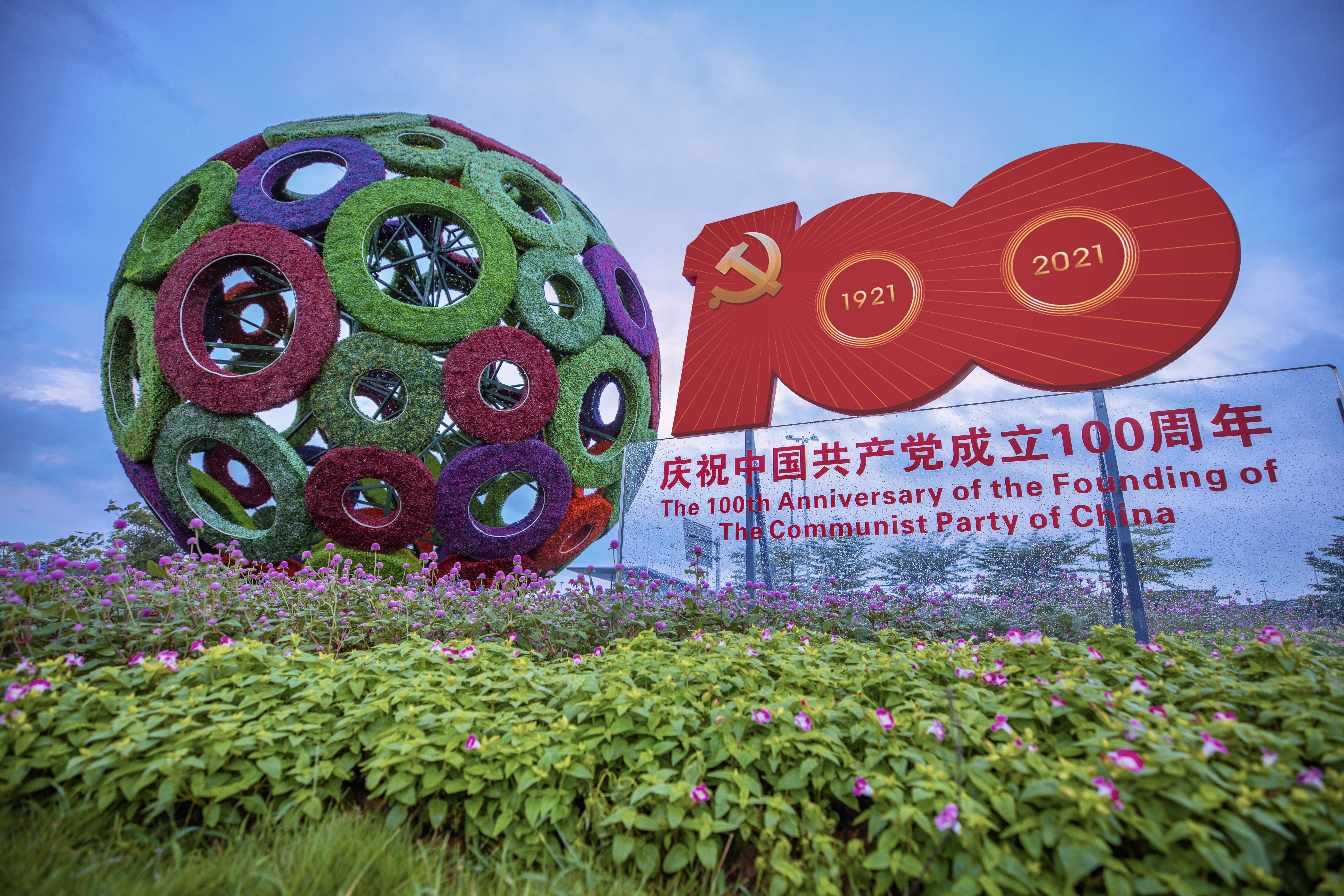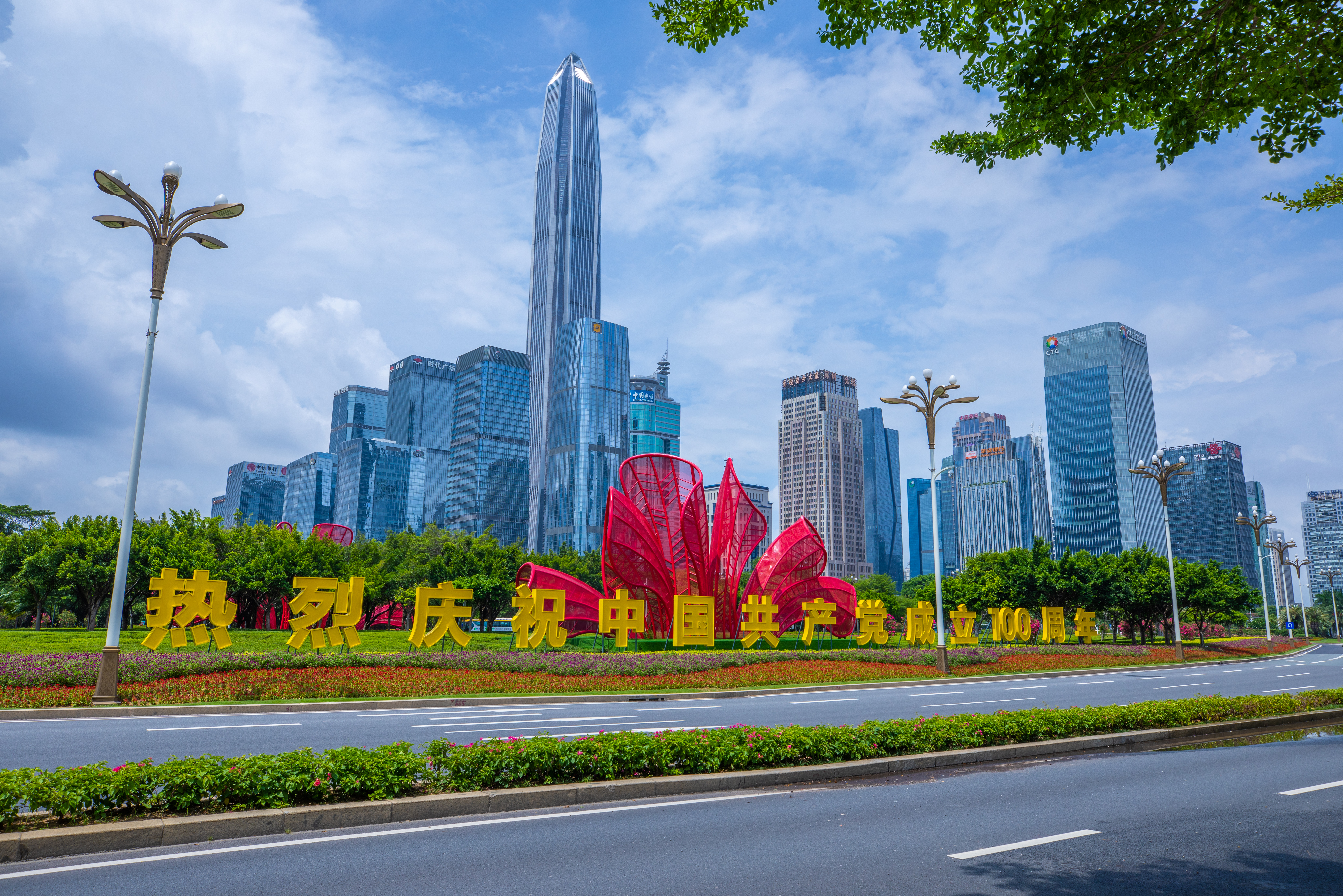 (大公文匯網 記者 郭若溪)火紅的月季花、紫紅的簕杜鵑……「七一」前夕,深圳全市各主次幹道和重要節點花團錦簇,裝點一新,慶祝建黨百年主題標識隨處可見,深南大道各大樓宇間「滿屏」飄動的祝福,深圳處處洋溢着喜迎建黨百年的濃烈氛圍。