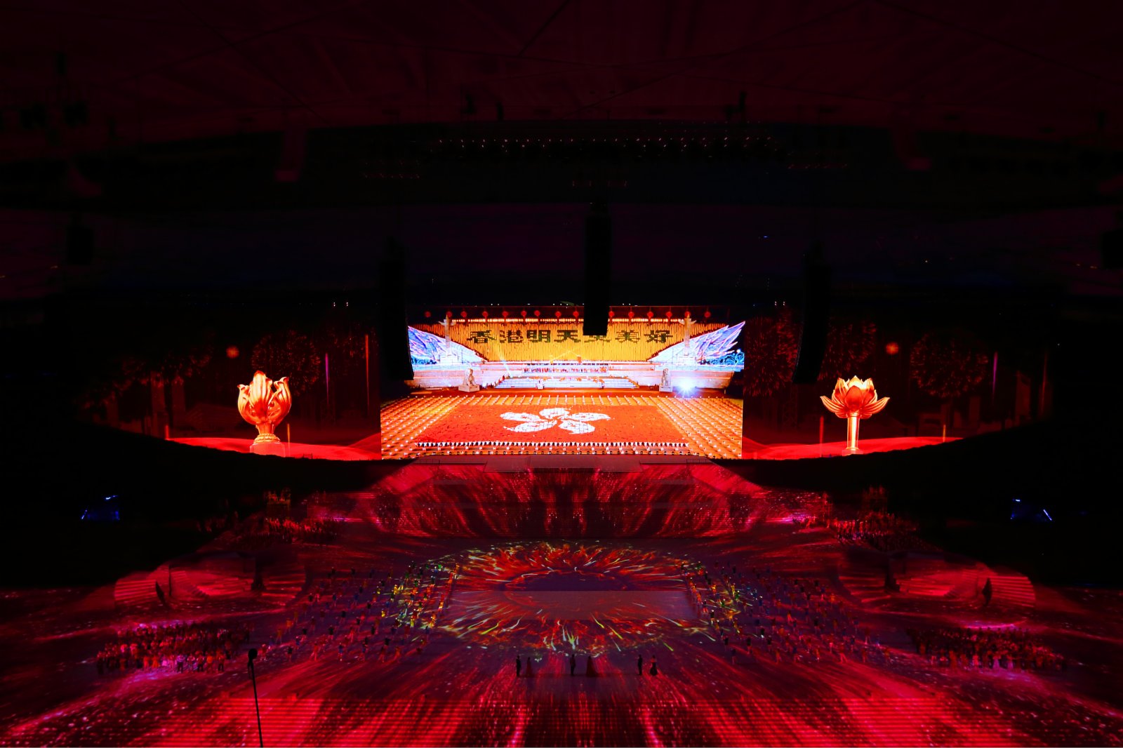 (大公文匯網記者 張帥)慶祝中國共產黨成立100周年文藝演出《偉大征程》,6月28日晚在國家體育場盛大舉行。演出第三篇章為「激流勇進」,其中情景合唱與舞蹈《回歸時刻》、詩朗誦與合唱《跨越》兩個節目都表現了一九九七年歡慶香港回歸祖國懷抱的重要事件。本報記者在現場看到,一艘遊船緩緩駛過安靜美好的維多利亞港,船身上「香港明天更美好」七個大字,傳遞出全國人民對香港這顆「東方之珠」的祝福。