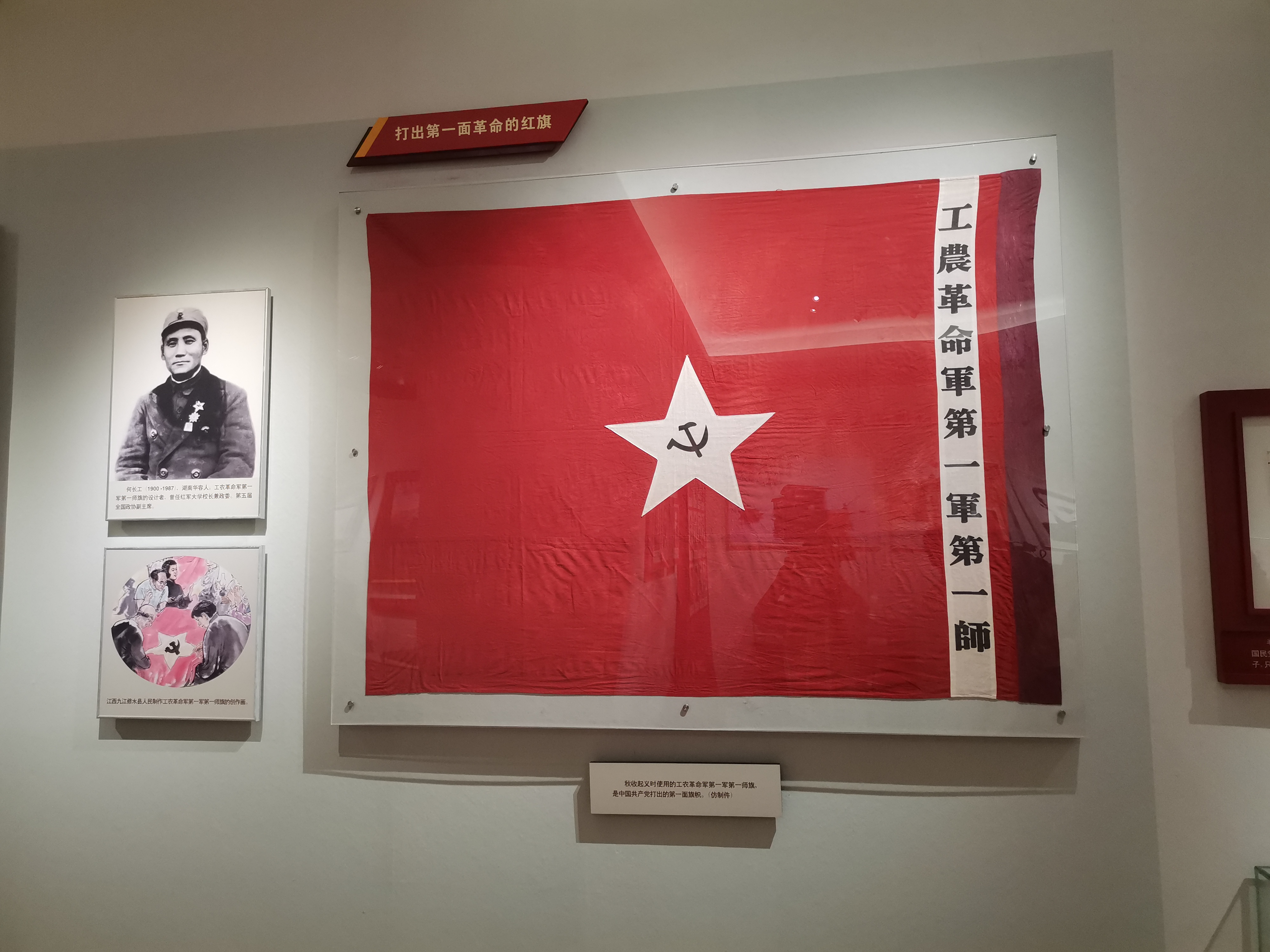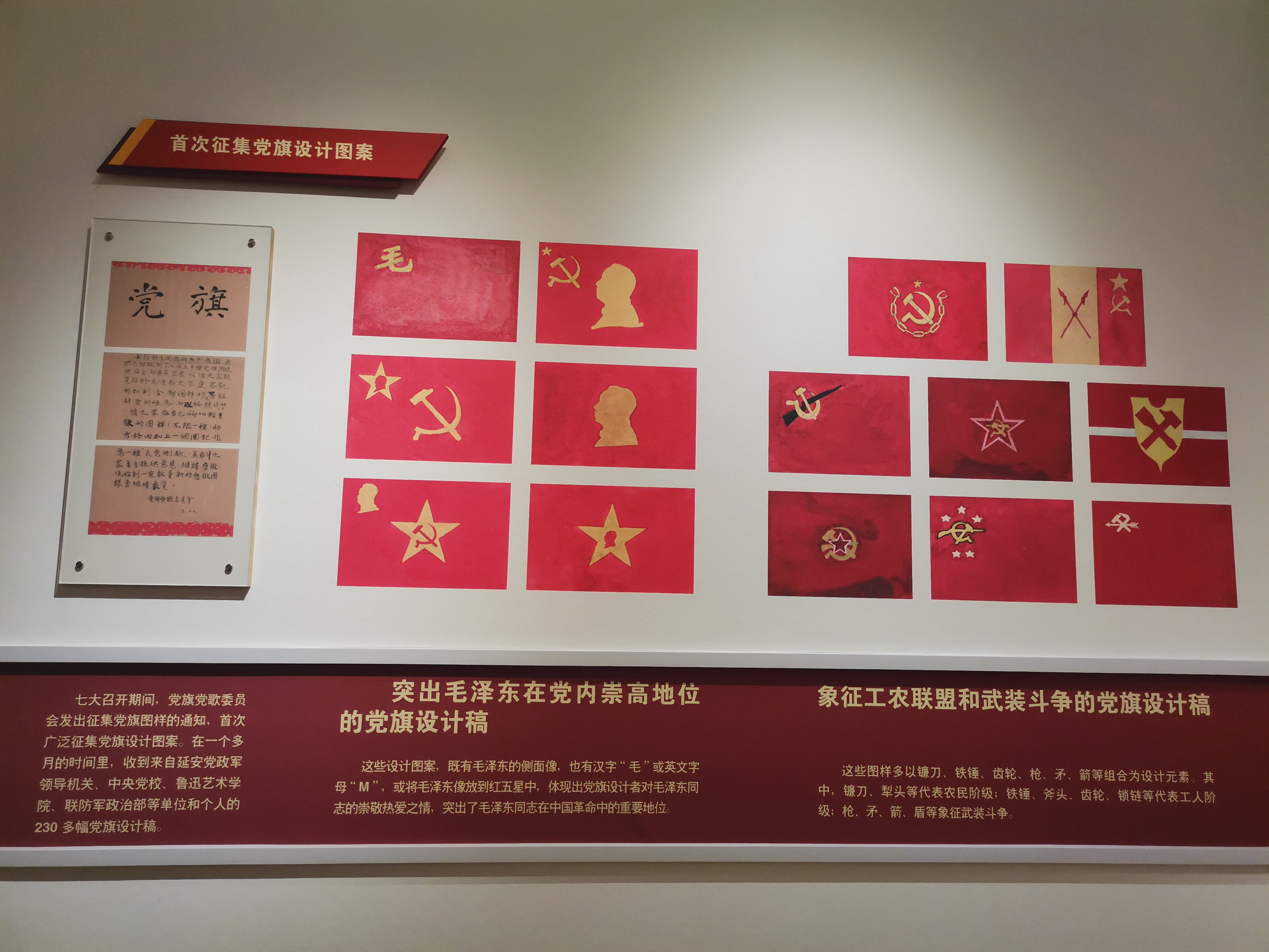 在「黨旗的誕生」部分,展出了中國共產黨打出的第一面旗幟——工農革命軍第一軍第一師旗、中國彞民紅軍沽雞支隊隊旗等珍貴實物展品;並通過大量檔案文獻揭示黨旗式樣從鐮刀斧頭到鐮刀鎚頭的數次變化;還呈現了中共七大期間徵集的十種類型黨旗設計稿圖案等。