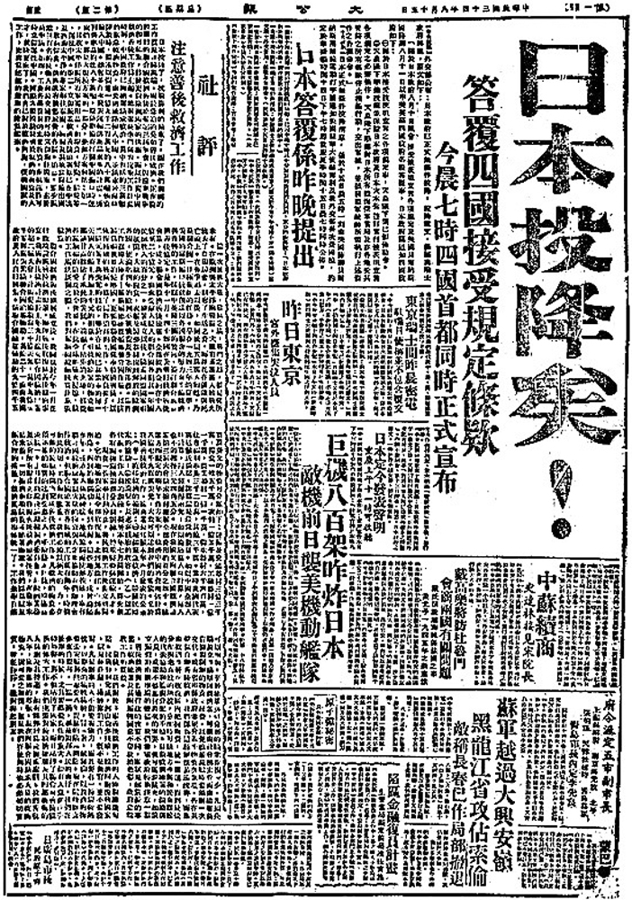 大公報頭版用五個超大號黑體鉛字「日本投降矣!」,向全國人民報道了抗戰勝利消息。