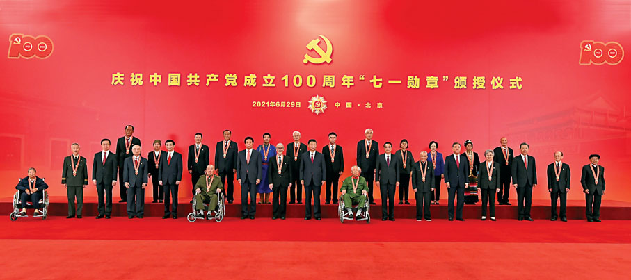 頒授儀式後,習近平等領導同志同「七一勳章」獲得者合影留念。