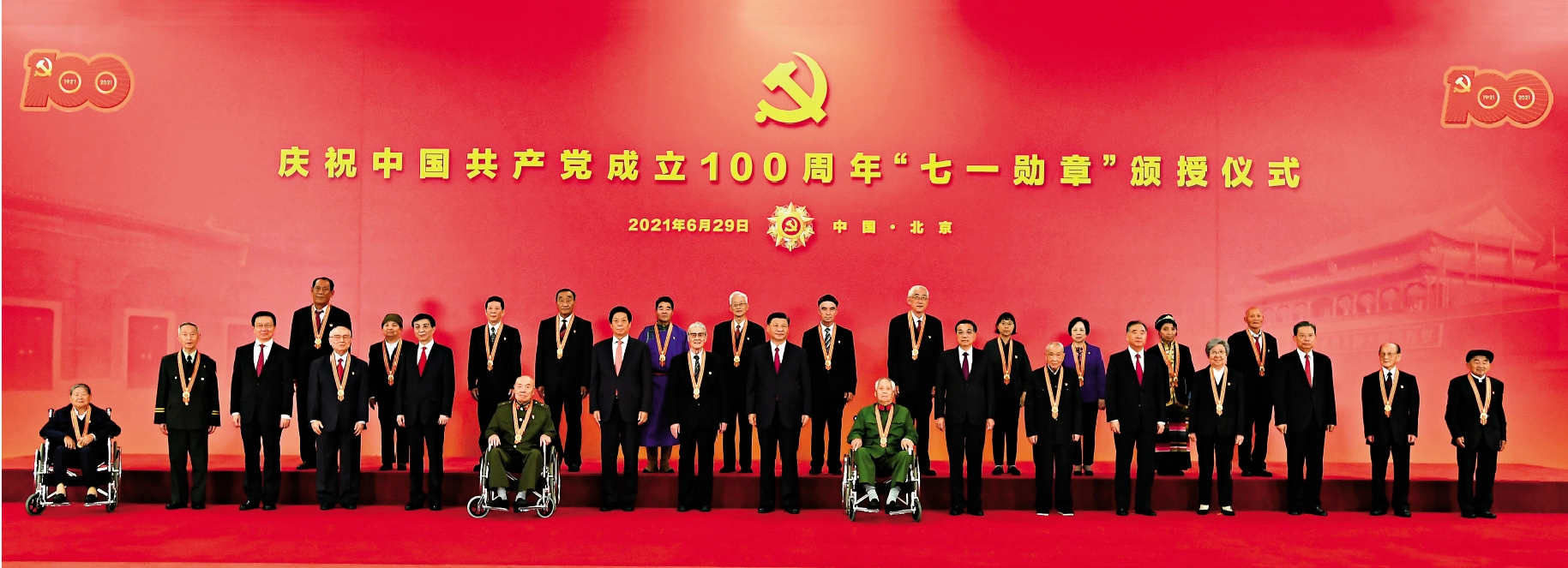 大公報報道,慶祝中國共產黨成立100周年「七一勳章」頒授儀式29日上午在北京人民大會堂金色大廳隆重舉行。中共中央總書記、國家主席、中央軍委主席習近平向29位「七一勳章」獲得者頒授勳章並發表重要講話,這是「七一勳章」首次頒授。習近平指出,「七一勳章」獲得者都來自人民、植根人民,是立足本職、默默奉獻的平凡英雄。他們的事跡可學可做,他們的精神可追可及。他們用行動證明,只要堅定理想信念、堅定奮鬥意志、堅定恆心韌勁,平常時候看得出來、關鍵時刻站得出來、危難關頭豁得出來,每名黨員都能夠在民族復興的偉業中為黨和人民建功立業。