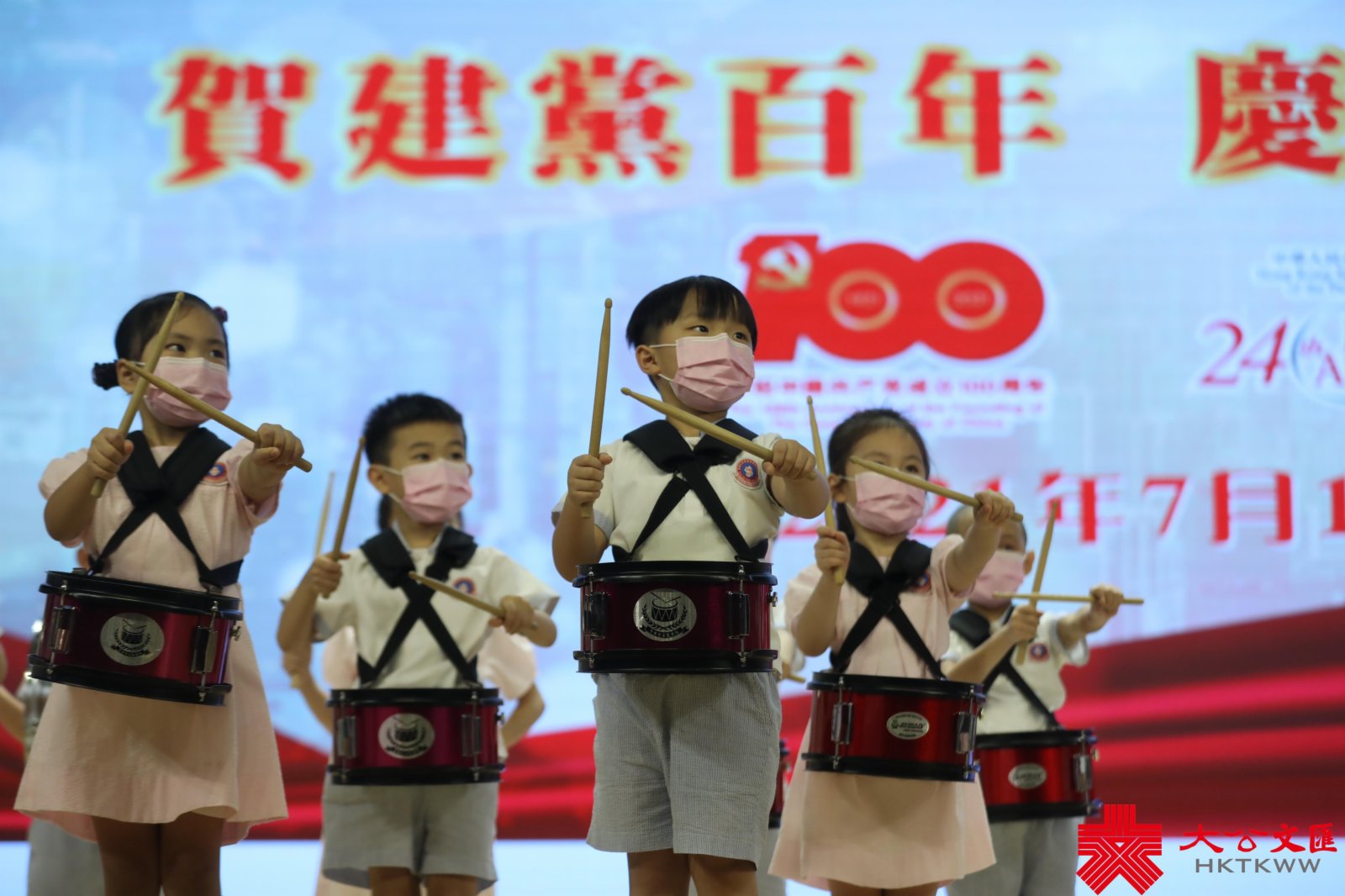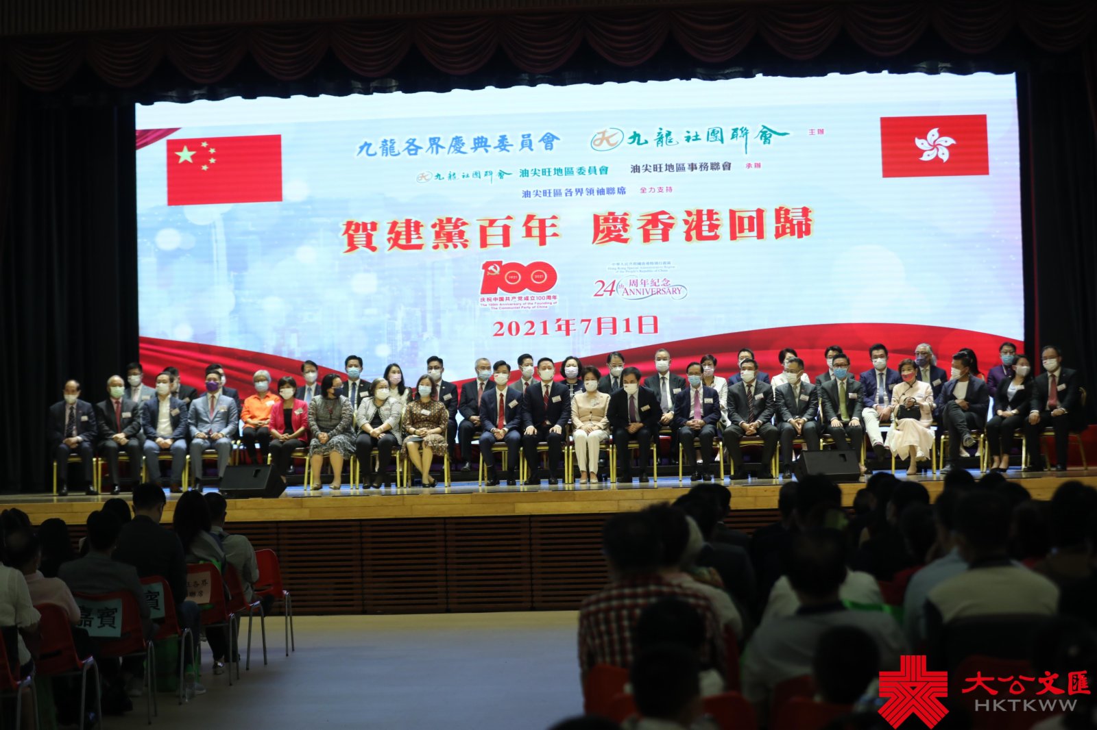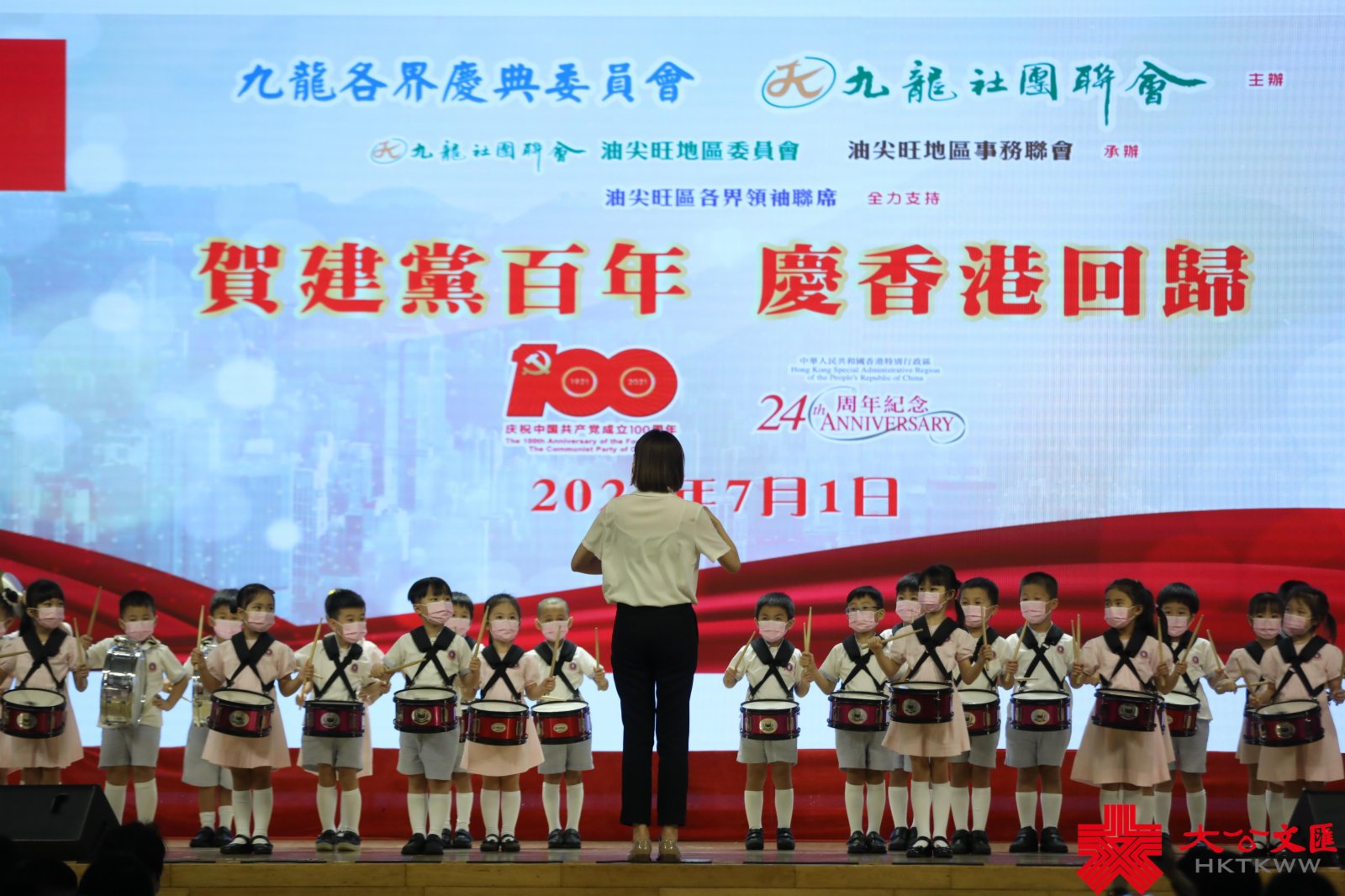 (香港文匯報記者 子京)由九龍各界慶典委員會、九龍社團聯會主辦的「賀建黨百年 慶香港回歸」慶祝活動於今日下午假尖沙咀街坊福利會會堂舉行。活動在香港青少年軍總會護旗隊迎國旗、區旗的莊嚴儀式中開幕,並以鼓樂、歌曲、舞蹈表演等多種形式進行慶祝,九龍數百市民街坊一同慶賀建黨百年華誕,分享香港回歸祖國24周年的喜悅。