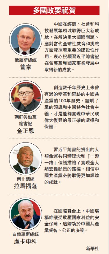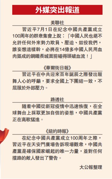 (大公報記者 公孫淑)慶祝中國共產黨成立100周年大會7月1日在北京隆重舉行,習近平總書記的講話在國際間引起巨大反響,「中國人民絕不允許任何外來勢力欺負、壓迫、奴役我們」,「誰妄想欺負中國,必將在14億多中國人民用血肉築成的鋼鐵長城面前碰得頭破血流」成為外媒的關鍵詞,認為是向美國和西方企圖「遏制中國」的有力回應。俄羅斯總統普京等多國政要紛紛致電致函,高度盛讚中共建黨百年來,中國各項事業取得巨大發展和進步。