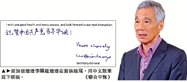 據新加坡《聯合早報》報道,新加坡總理李顯龍總理7月1日以新加坡人民行動黨秘書長身份,向中共中央總書記、國家主席、中央軍委主席習近平致函祝賀中共建黨100周年。賀信結尾,李顯龍還用中文親筆寫下「祝賀中國共產黨百年華誕!」一行字。