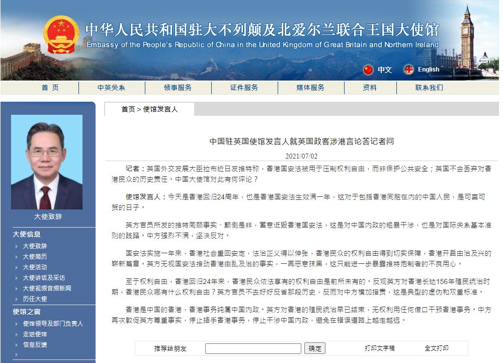 關鍵詞:中國駐英使館藍韜文英國香港國安法