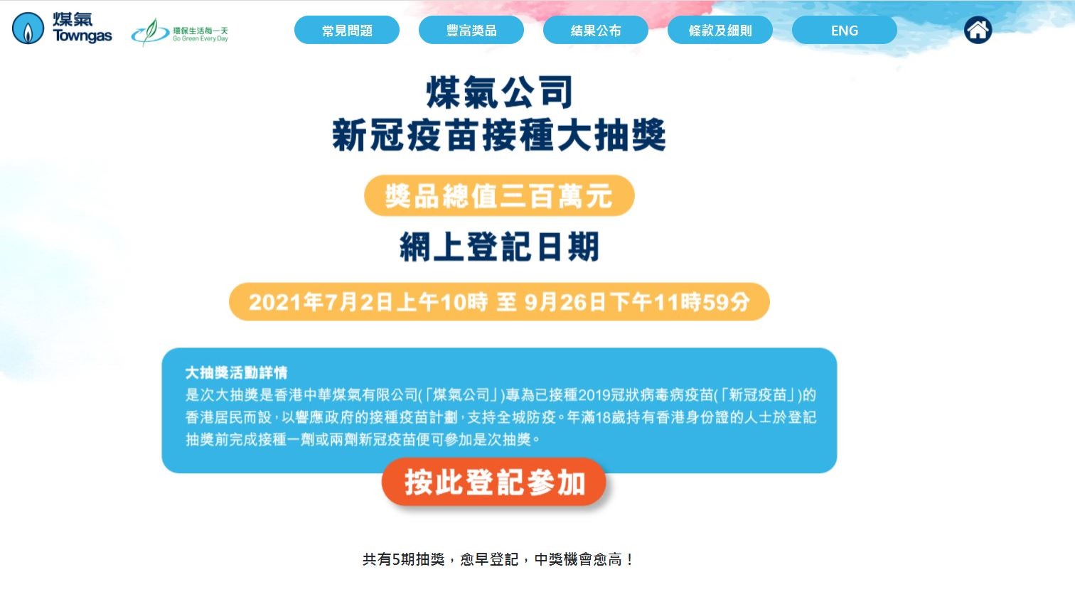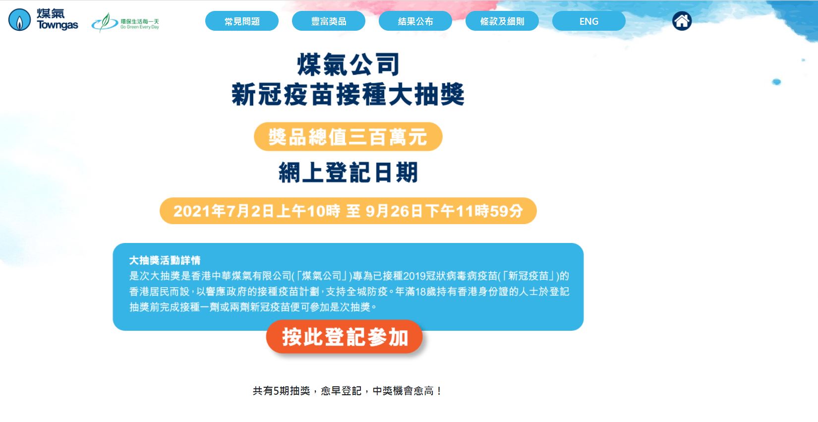 大公文匯全媒體報道,為鼓勵市民接種新冠疫苗,商業機構紛紛推出獎賞優惠。恒基兆業集團系内的香港中華煤氣有限公司推出疫苗推廣活動,送出總值300萬元獎賞。大抽獎於今日(2日)早上10時開始接受登記,所有合資格的參加者須透過活動網頁進行登記。