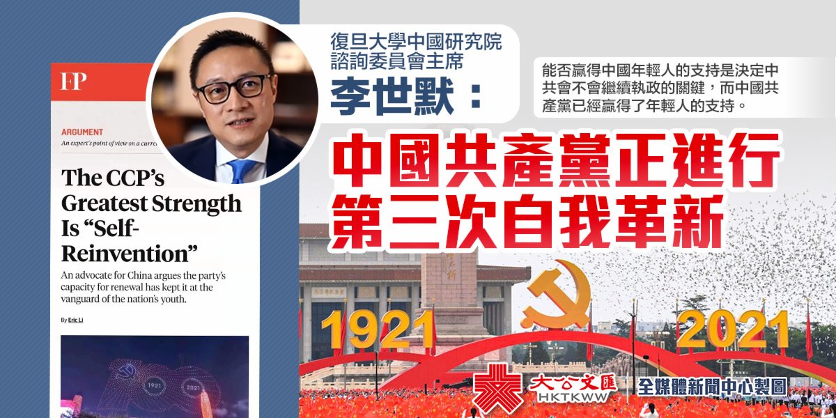 大公文匯全媒體報道,復旦大學中國研究院諮詢委員會主席李世默近日在美國著名政經網站「外交政策」發表文章,評論中國共產黨在其100周年誕辰之際面臨的機遇和挑戰。李世默指出,中國共產黨能在這個全世界人口最大的國家長期執政,靠的是它一直堅守自己的兩大特質——自我實現和自我革新。他強調,雖然外界對中國有種種質疑和批評,但外國對中國的影響力有限,能否贏得中國年輕人的支持是決定中共會不會繼續執政的關鍵,而中國共產黨已經贏得了年輕人的支持。