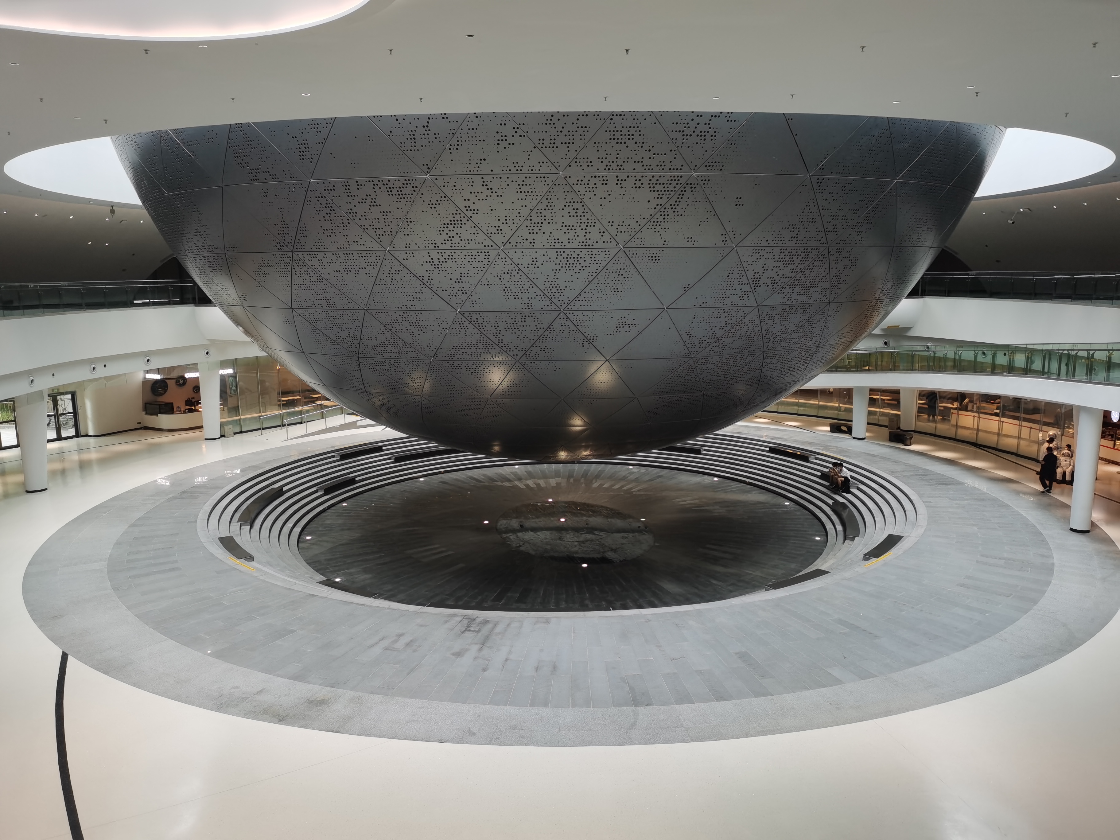 據悉,上海天文館主建築以螺旋形態構成「天體運行軌道」,獨具特色的圓洞天窗、球幕影院和倒轉穹頂這三個圓形元素構成「三體」結構,共同詮釋天體運行的基本規律。其中,圓洞天窗位於主建築的入口,當太陽光穿過圓洞,會在地面形成光斑,隨着太陽在天空中移動,光斑也將在地面上緩緩移動,起到類似日晷的作用。