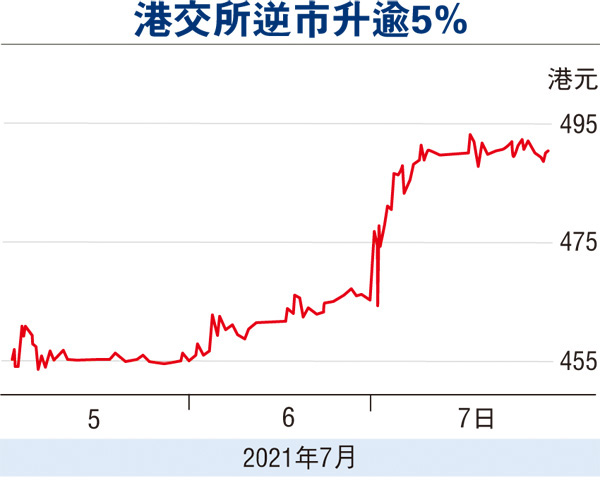 第一上海首席策略師葉尚志昨日表示,港交所昨日連升第二日,再逆市上升5.32%至491元收盤,成交金額激增至94億元。一方面,相信是收納了一些從互聯網龍頭股出逃的資金,另一方面,國務院表示要加強中概股監管,市場憧憬將促使更多內地公司轉來香港上市,都是利好港交所吸資的消息誘因。他對港交所維持正面看法。