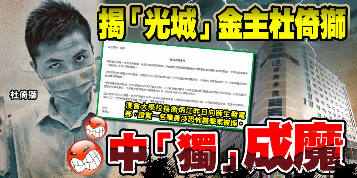 大公文匯全媒體報道,極端組織「光城者」策動炸彈恐怖襲擊,涉嫌付酬予中學生做炸彈「死士」的大學公關及傳訊主任杜倚獅,及任職中學行政人員的妻子石詠心,昨獲保釋候查。記者追查發現,被市民指斥為「毒教育工作者」的杜倚獅,因受近十年黃媒及社會瀰漫的煽暴氛圍影響下,走上「獨」路成魔。