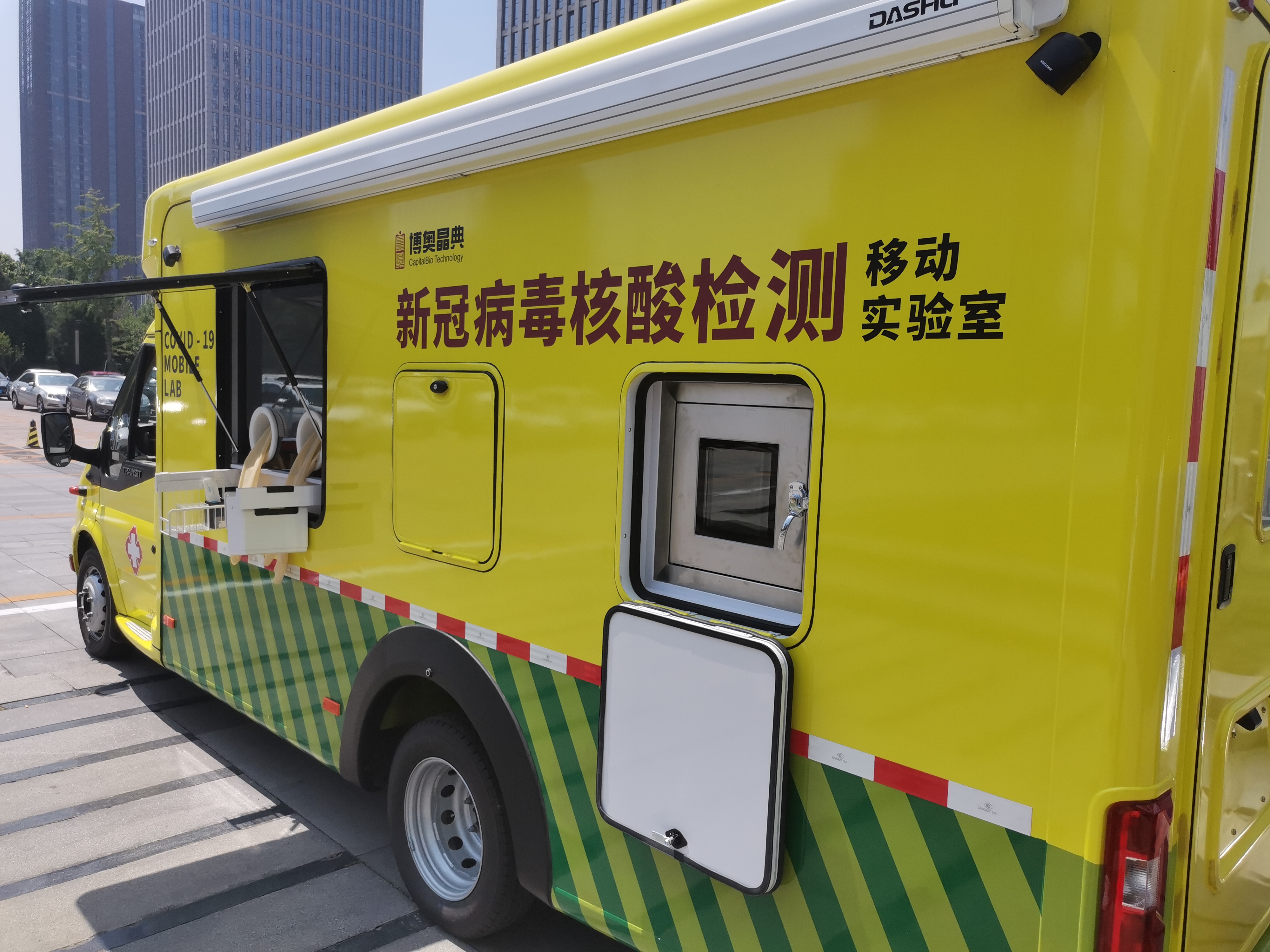 記者在發布現場看到,該款搭載核酸檢測移動實驗室的車輛通身黃色,車長不到7米,車身醒目標有「新冠病毒核酸檢測移動實驗室」字樣,並留有人工採樣窗口和機械臂採樣窗口。據博奧晶典市場品牌中心經理李騰介紹,採樣後工作人員可立即將樣本注入全集成芯片上的小孔,然後將芯片置入全自動核算分析儀中,45分鐘即可出檢測結果,陽性結果則只需35分鐘,檢測結果會第一時間上傳到數據平台。據悉,這一移動實驗室每天最高檢測能力大約2000人,較適合海關、邊境、大型會議等應急使用。