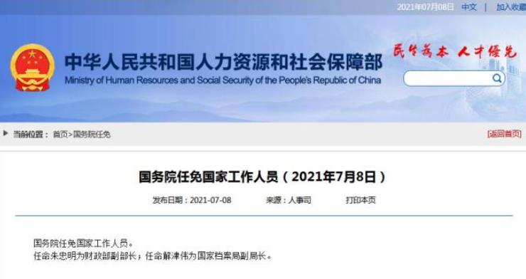 據人社部網站消息,國務院任免國家工作人員。任命朱忠明為財政部副部長;任命解津偉為國家檔案局副局長。