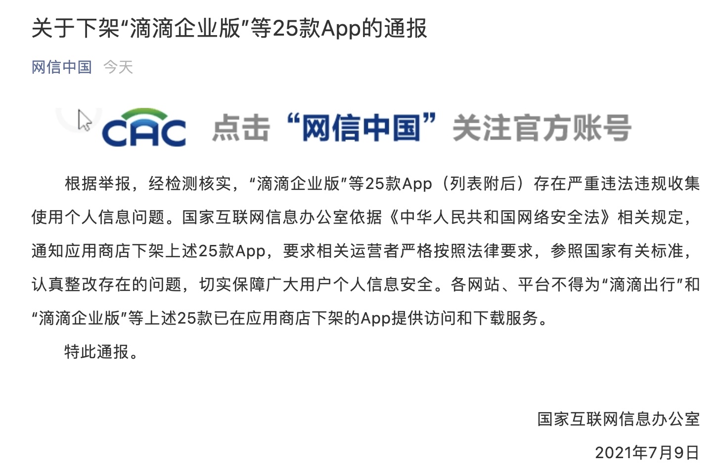 據「網信中國」微信公眾號今日(9日)消息,根據舉報,經檢測核實,「滴滴企業版」等25款App(列表附後)存在嚴重違法違規收集使用個人信息問題。國家互聯網信息辦公室依據《中華人民共和國網絡安全法》相關規定,通知應用商店下架上述25款App,要求相關運營者嚴格按照法律要求,參照國家有關標準,認真整改存在的問題,切實保障廣大用戶個人信息安全。各網站、平台不得為「滴滴出行」和「滴滴企業版」等上述25款已在應用商店下架的App提供訪問和下載服務。