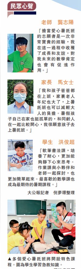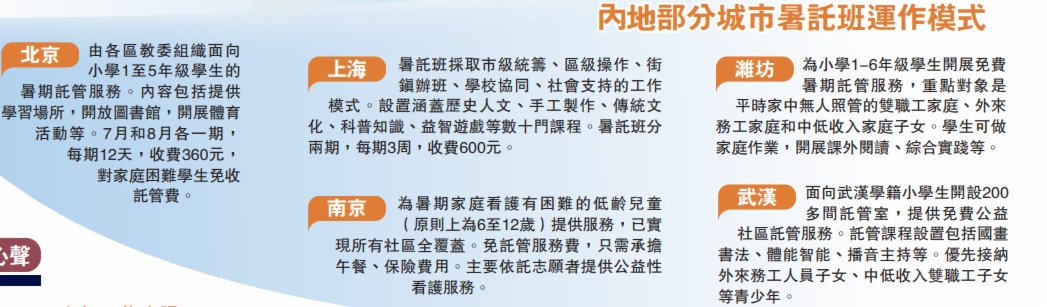 (大公報記者 江鑫嫻、丁春麗、倪夢璟)為解決學生暑期「看護難」問題,教育部9日發布消息稱,要引導支持有條件的地方積極探索開展暑期託管服務工作。不強制師生參加,託管服務中不得組織集體補課、講授新課。暑期託管服務堅持公益普惠原則,採取財政補貼、收取服務性收費等方式籌措經費。據悉,北京、上海、武漢等多地已陸續推出暑期託管服務,如北京將收取每天30元(人民幣,下同)的託管費,對家庭困難學生免收託管服務費用。對此,有家長認為,官方託管既安全又便宜,還可享補貼,令人安心。