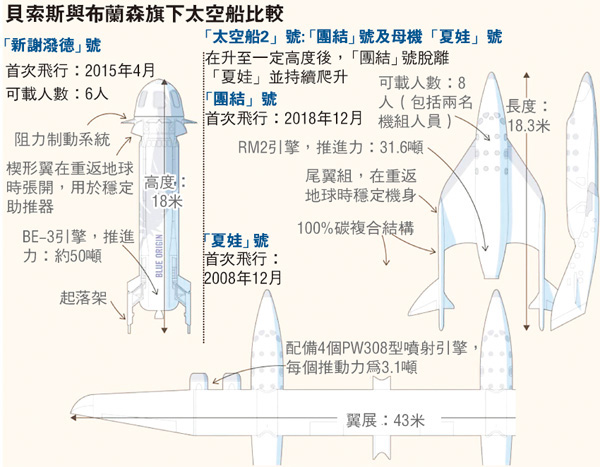 貝索斯名下太空企業「藍色起源」尚未宣布商業太空旅遊計劃,不過首次升空的「新謝潑德」號飛船其中一個名額,已於上月以2,800萬美元(約2.2億港元)高價拍出。較維珍銀河更進一步,「新謝潑德」號將進行「次軌道太空旅遊」,太空船將飛抵太空邊緣作短暫航行,乘客事先無須接受複雜訓練,即可親身體驗太空之旅。