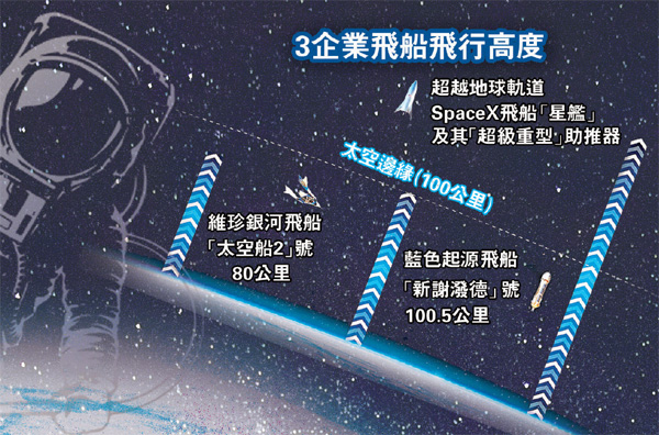 全球多國企業近年均積極發展太空探索技術,冀爭奪潛力無限的太空旅遊市場。英國維珍銀河太空旅遊公司創辦人布蘭森搶先一步,將於明日乘坐旗下太空船升空,美國電子商貿巨擘亞馬遜創辦人貝索斯亦緊隨於本月20日飛上太空,太空探索公司SpaceX行政總裁馬斯克則計劃今年9月啟動載人太空之旅,3位億萬富豪均希望搶佔先機。