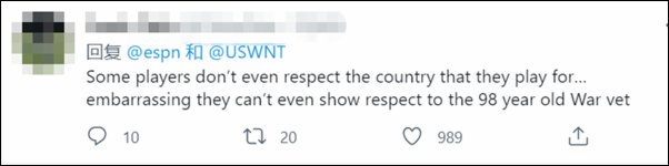 另外,評論文章也給美國女足的聲明挑刺,認為美國國家女子足球隊的聲明是避重就輕,因為聲明只強調了沒有一個球員「在今晚的國歌中背對二戰老兵」,「球員們都愛他」。但是,聲明中並沒有強調說會尊重美國國旗。