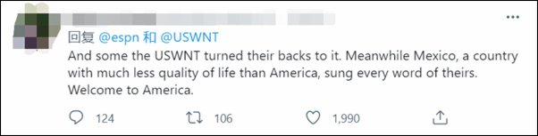 「美國國家女子足球隊的隊員背過了身,但墨西哥隊員卻一字不落地唱了她們的國歌。歡迎來美國。」