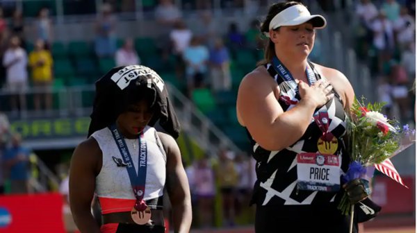 今年6月26日,美國黑人運動員格溫·貝瑞(Gwen Berry)在美國國歌奏響時,低頭不看美國國旗,還選擇側身站着,最後把寫有「運動員活動人士」的黑色T恤蓋在了頭上,抗議美國對黑人的系統性種族歧視。