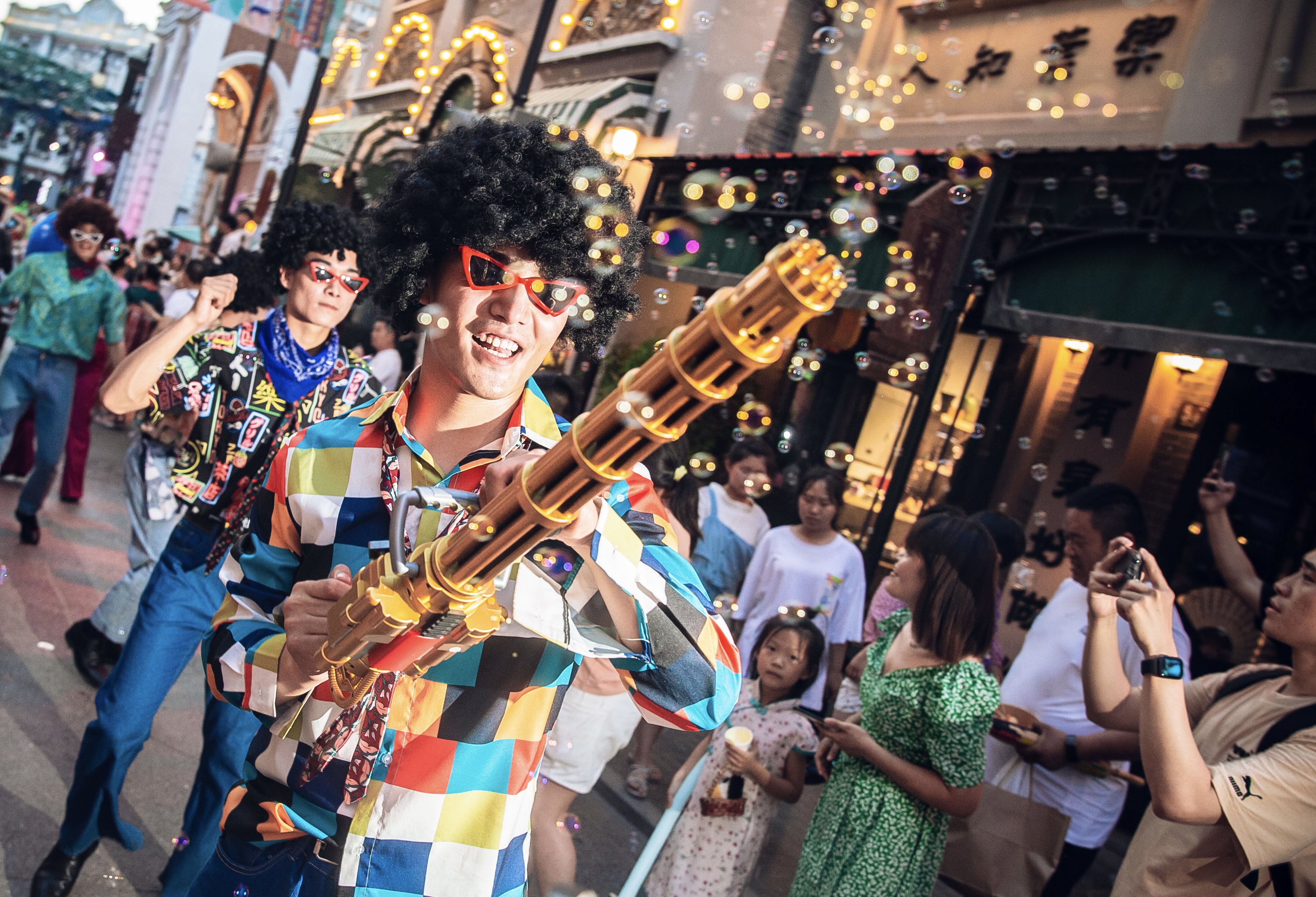 本次「夏日狂歡節」以穿越、青春和懷舊為主要元素,用沉浸式的表演和新穎的演出形式,營造一個極富年代感、極具青春活力的夏日記憶。不管你是身處假期無處安放的「學生黨」,還是晝伏夜出的「夜貓子」,都能在夏日狂歡節找到屬於自己的夏日狂歡。遊客可以換上港風服裝,體驗復古disco快閃秀,現場感受潮流樂隊致敬經典金曲,參與夏日狂歡大巡遊,再來一場釋放自我的摩登蹦迪,最後和夥伴們在水碼頭酣暢淋漓地潑水狂歡,就是要嗨玩一夏。