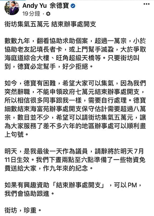 余德寶日前喺fb以「街坊集氣五萬元 結束辦事處開支」為題發帖,佢話:「如今,德寶有困難,希望大家可以集氣,因為我們突然辭職,不能申領政府七萬元結束辦事處開支……細數結束海富苑辦事處開支保守估計需要超過八萬宗(元),數目並不少,希望可以請街坊集氣五萬元……」