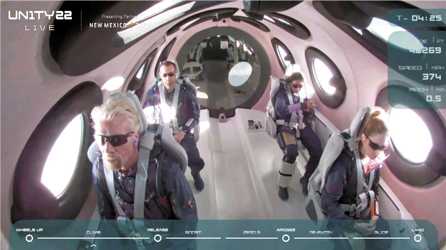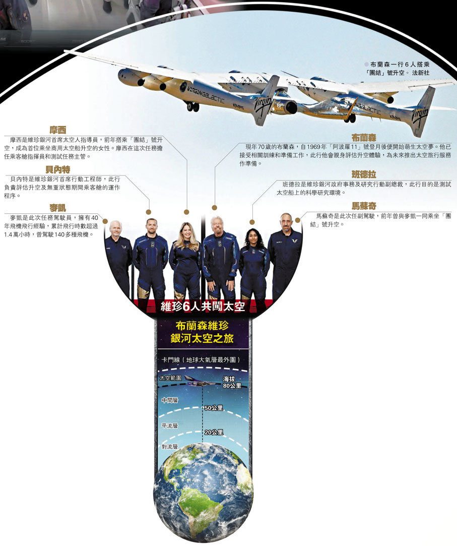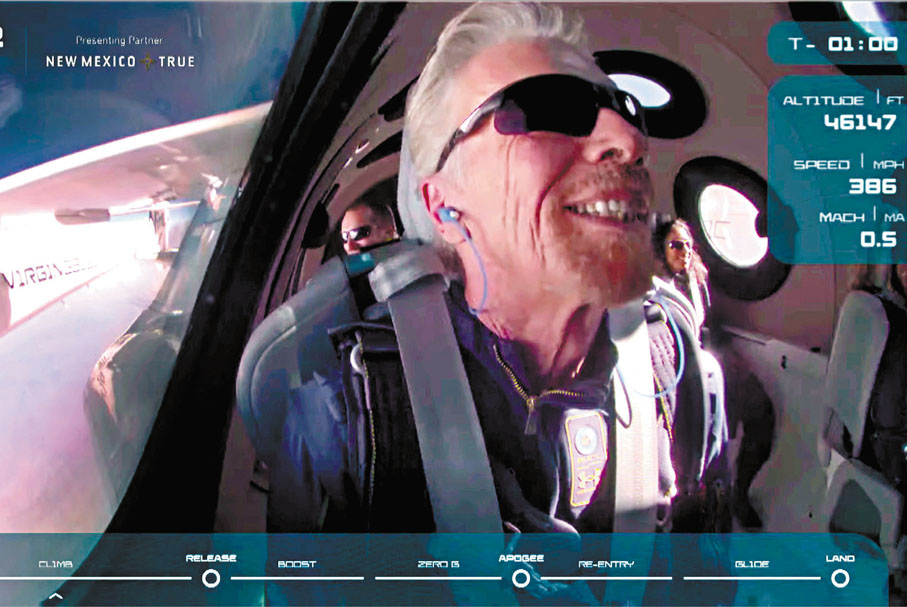 香港文匯報綜合報道,英國維珍集團創辦人布蘭森於美國山區時間昨晨8時40分(香港時間昨晚10時40分),聯同另外5人,乘坐名下維珍銀河的商用載客太空船「團結」號,從美國新墨西哥州太空港發射基地升空,並成功在接近太空邊緣體驗無重力狀態,再安全重返地面,完成人類史上首次商業太空之旅,為太空旅遊商業化揭開序幕。不過這段旅程引來不少質疑,尤其全程只有60分鐘,而且只飛到美國對「太空邊緣」的定義高度左右,被認為說不上是真正「太空旅行」。