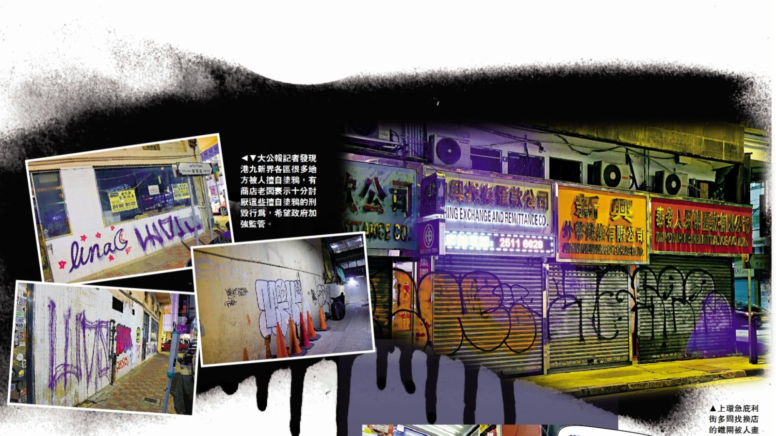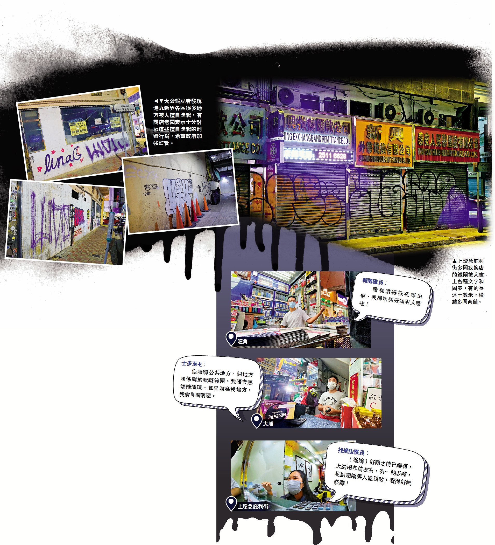 「大概兩年前,有一日返舖頭開舖時,見到成條街舖頭嘅鐵閘畀人塗鴉,覺得好無奈。」一間找換店的職員王小姐向大公報記者表示,當日發現後曾經報警,但至今未有人被捕,「你話靚都算啦,但唔靚吖嘛,又無問過我哋批唔批准就塗鴉,我覺得呢啲行為好討厭。」