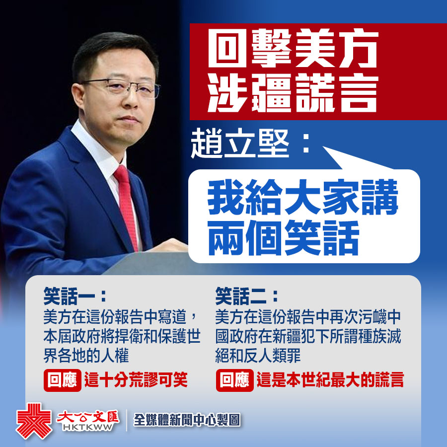 「美國有些人自己生了病,卻老想着給別人把脈開藥,按這種荒謬邏輯做出來的報告,就是廢紙一張。」趙立堅說,「我再給大家講個笑話,美方在這份報告中再次污衊中國政府在新疆犯下所謂『種族滅絕和反人類罪』,這是本世紀最大的謊言。」