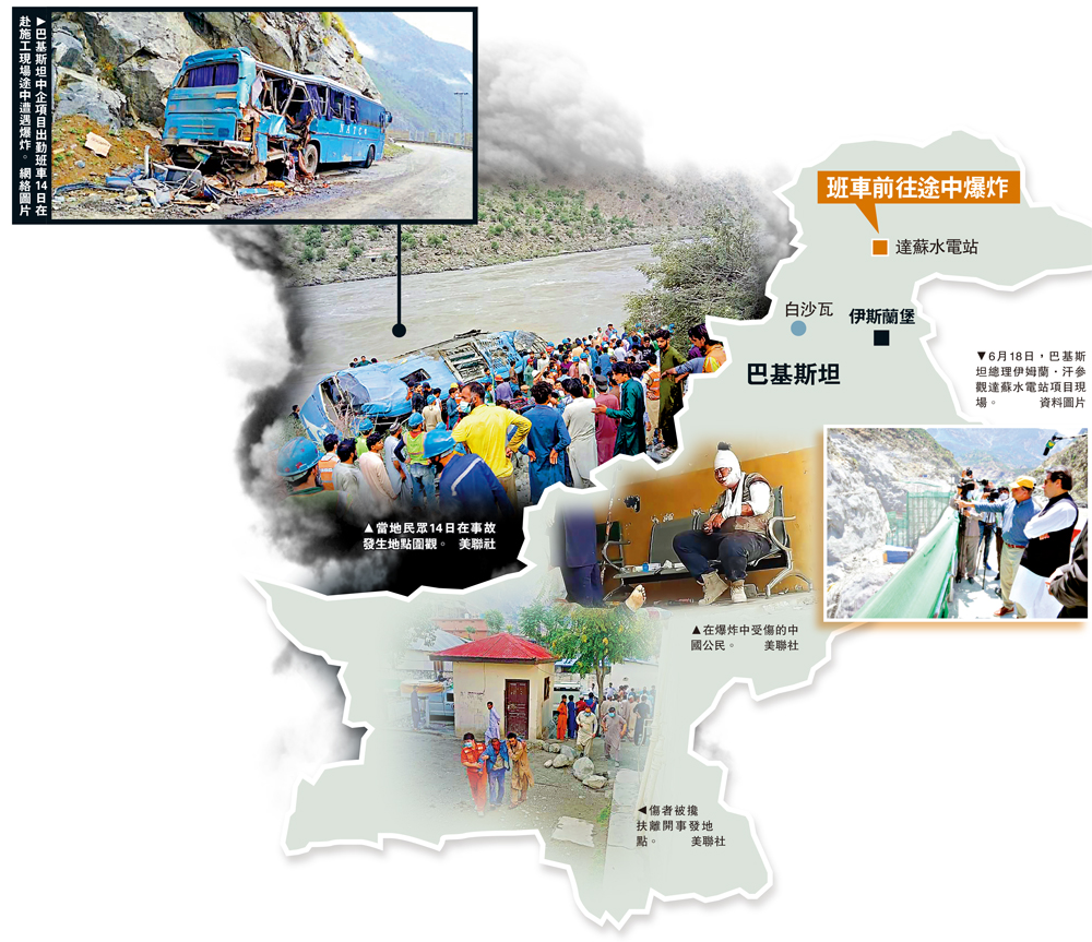 (大公報記者 公孫淑)中國駐巴基斯坦大使館14日證實,當地時間上午7時左右,由中方企業承建的開普省達蘇水電站項目出勤班車在赴施工現場途中遭遇爆炸,造成包括9名中方人員在內的13人死亡。中國外交部14日下午表示,對巴基斯坦開普省發生炸彈襲擊造成中方人員傷亡表示震驚和譴責,要求巴方盡快緝拿兇手。巴基斯坦外交部官網隨後公布了初步調查結果:與機械故障導致的氣體洩漏有關。