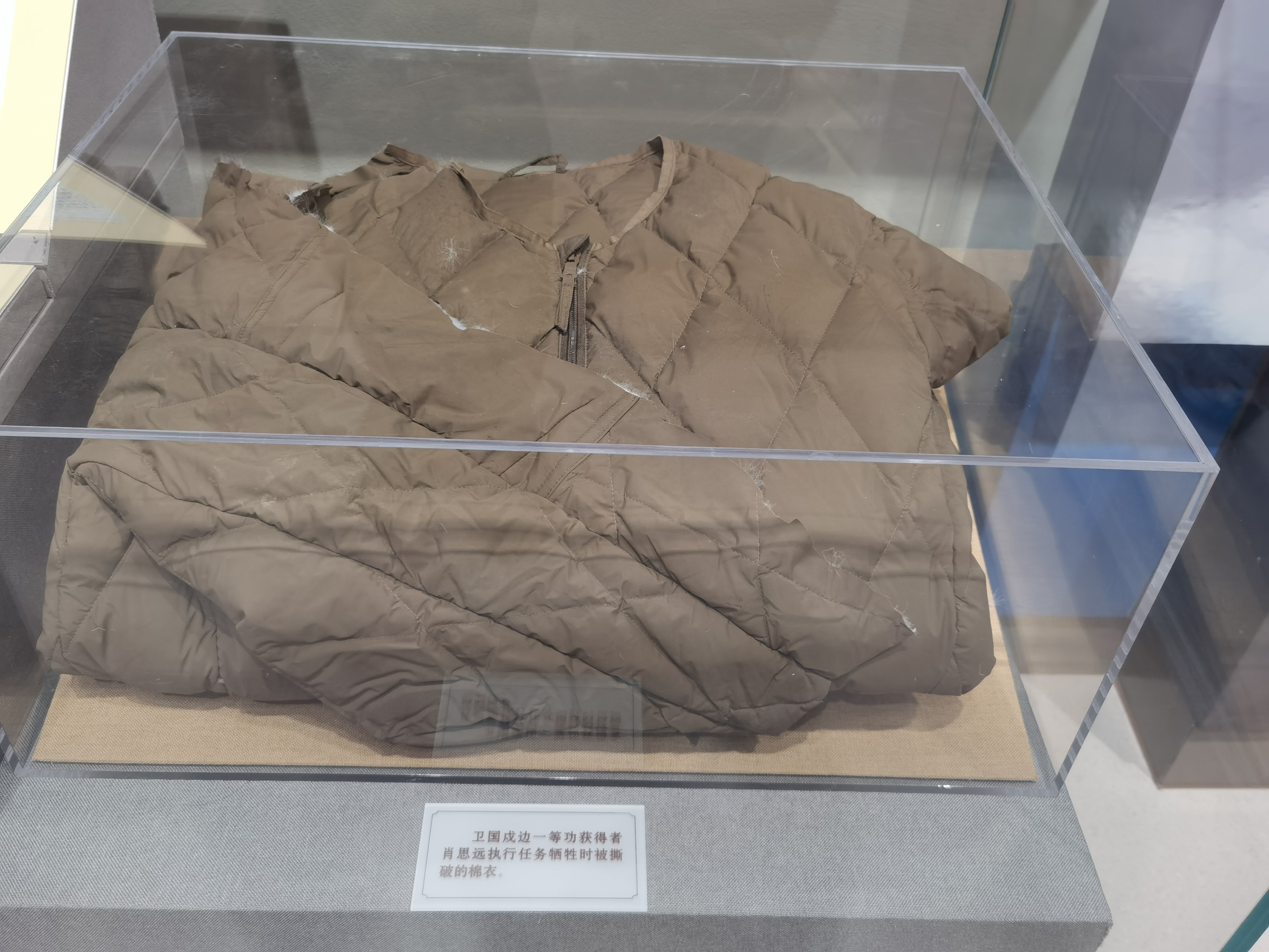 在展區的展櫃中,還靜靜躺着一件軍綠色的棉衣,讓很多參觀者為之駐足。它屬於24歲的烈士肖思遠。展櫃中這件被疊的整整齊齊的棉衣,帶着些汗漬,外露着白色的棉絮。這是經過激烈鬥爭時撕扯後留下的痕迹。
