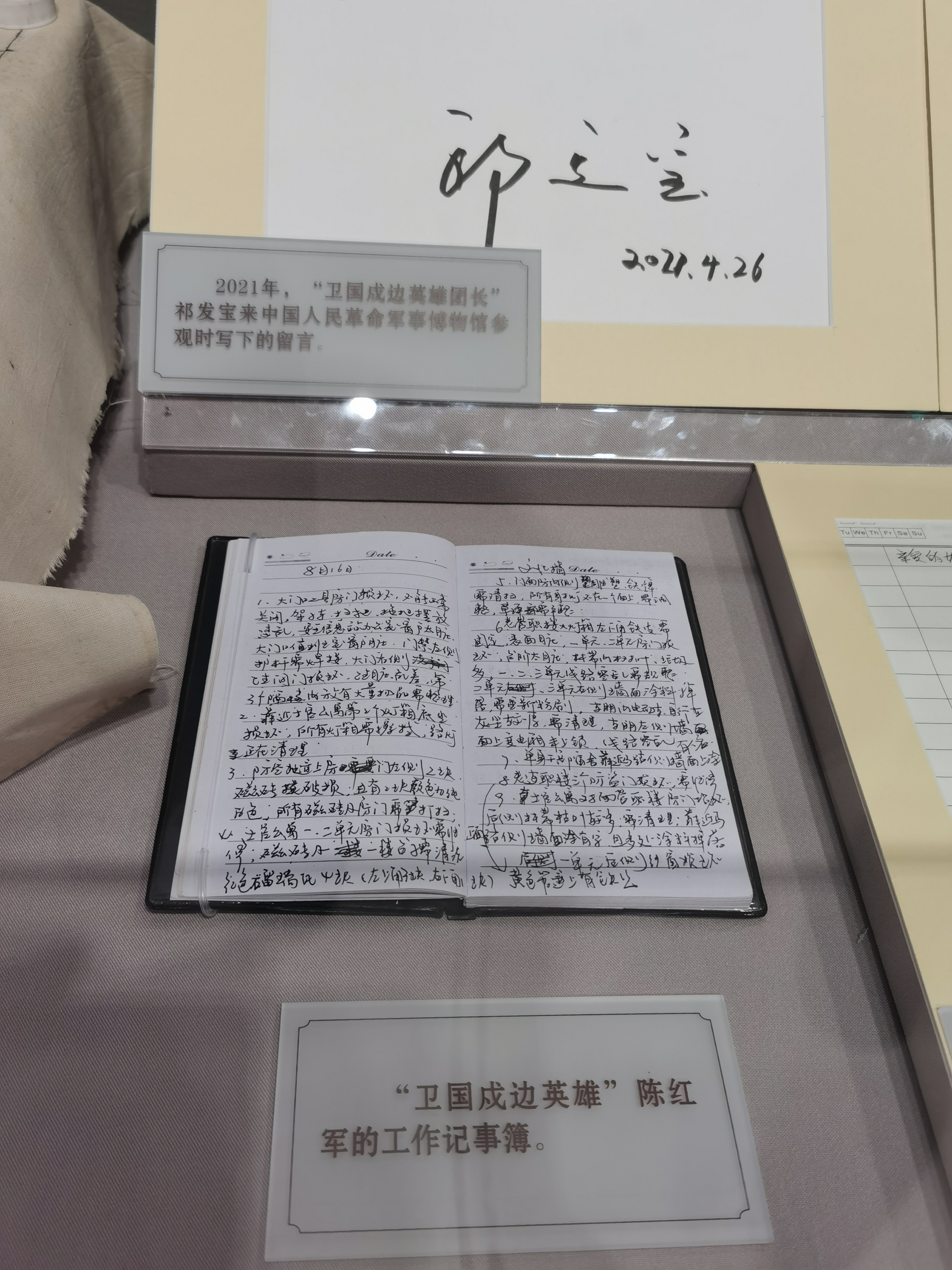 (大公文匯網記者 葛沖 北京報道)「衛國戍邊英雄團長」祁發寶的手書、「衛國戍邊英雄」陳紅軍的工作記事簿、一等功獲得者陳祥榕寫給媽媽的信、一等功獲得者肖思遠犧牲時被撕破的棉衣、一等功獲得者王焯冉的請戰書和入黨申請書……近日,衛國戍邊英雄遺物在軍事博物館正式對外展出。現場,「大好河山,寸土不讓!」八個大字和一件件英雄遺物,令現場參觀者們為之動容,一次次將人們的記憶帶回到去年6月的加勒萬河谷。