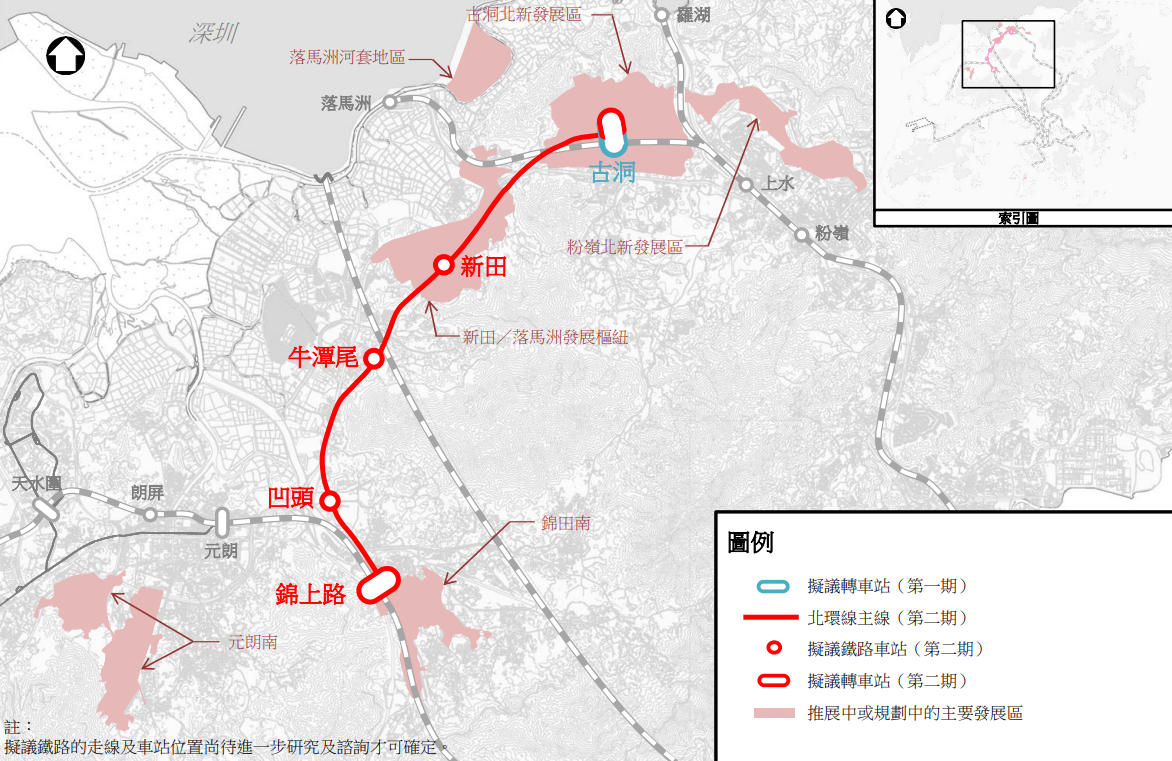 北環綫分兩期發展,先於落馬洲支綫增建古洞站,料2027年完工;第二期在錦上路站及古洞站之間興建北環綫主綫,在新田、牛潭尾及凹頭增設3個中途站,料2034年完工。