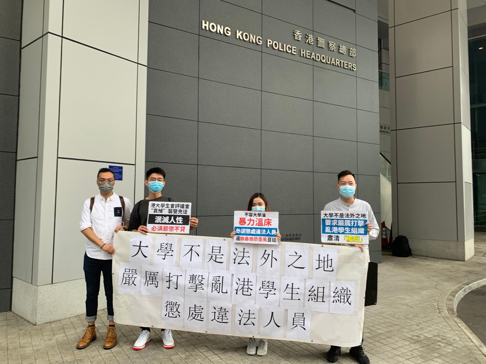 (大公報 記者 龔學鳴)市民團體今日分別於警察總部與香港大學正門外請願,強烈譴責學生會成員利用會內資源和牌頭明目張膽宣傳港獨,罔顧同學和學校的利益,違背學生會原有的宗旨和職能;要求嚴厲打擊亂港學生組織,開除違法人員。