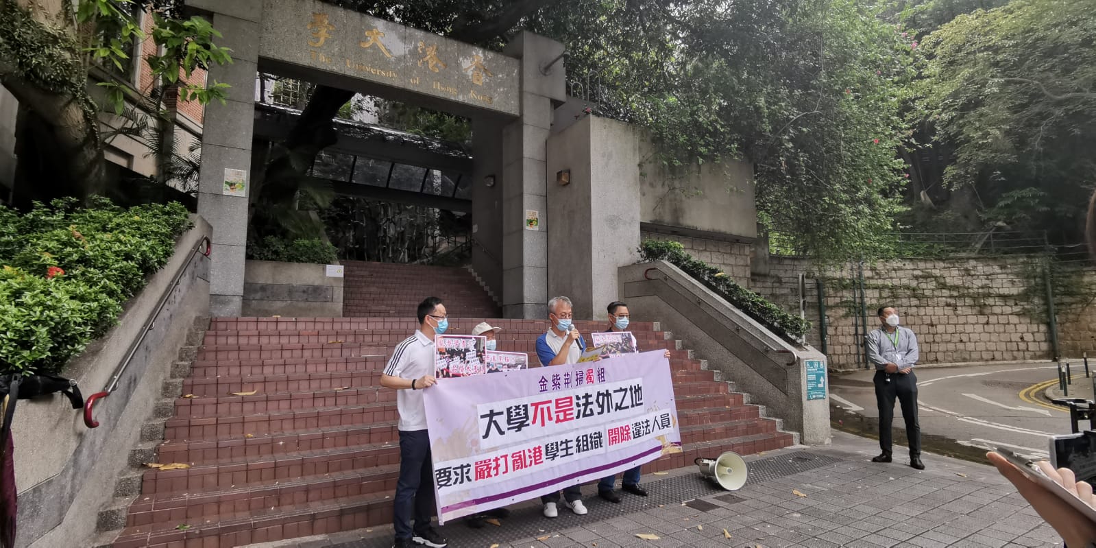 日前,香港大學學生會評議會通過所謂「感激」七一刺警案兇徒的議案,引起各界嘩然及譴責。今日上午,幾名年輕人於警察總部手持標語,譴責港大學生會「悼念」襲警兇徒,要求嚴厲打擊亂港學生組織,肅清「獨瘤」,遏制「煽暴煽恐」歪風蔓延。今日下午,金紫荊掃獨組成員來到港大正門外,手持「無良至極 開除學藉」、「麻木不仁 枉生為人」等標語,並高叫口號,抗議有學生會成員刻意顛倒是非黑白、試圖美化恐怖行為及公然挑戰法律底線,可能已觸犯國安法,要求予以嚴懲。