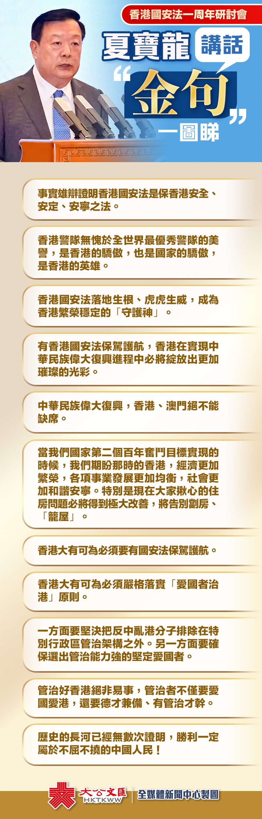 「香港國安法實施一周年回顧與展望」專題研討會今日(16日)舉行。全國政協副主席、國務院港澳辦主任夏寶龍出席開幕式並講話。「香港大有可為必須要有香港國安法保駕護航。」「香港大有可為必須嚴格落實『愛國者治港』原則。」「特別是現在大家揪心的住房問題必將得到極大改善,將告別劏房、『籠屋』。」夏寶龍今次講話還有哪些金句?快來睇下!