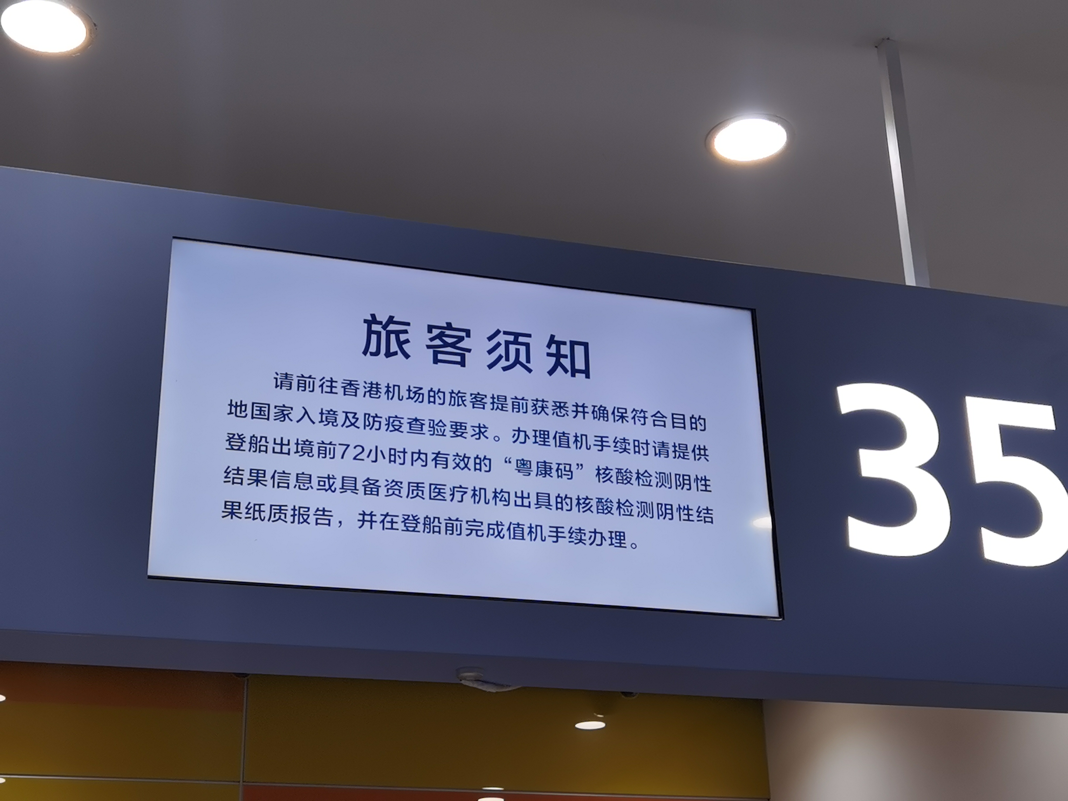 根據疫情防疫要求,旅客出境前需在「海關旅客指尖服務」小程序中完成個人出境健康申報,也可前往28號填報櫃枱由專人指引完成出境健康申報。登船出境前應提供72小時內有效的「粵康碼」核酸檢測陰性結果信息或具備資質醫療機構出具的核酸檢測陰性結果紙質報告。抵達香港機場海天碼頭後,所有旅客還需要在香港機場海天碼頭,由航空公司職員進行二次證件核查,及換取完整登機牌。